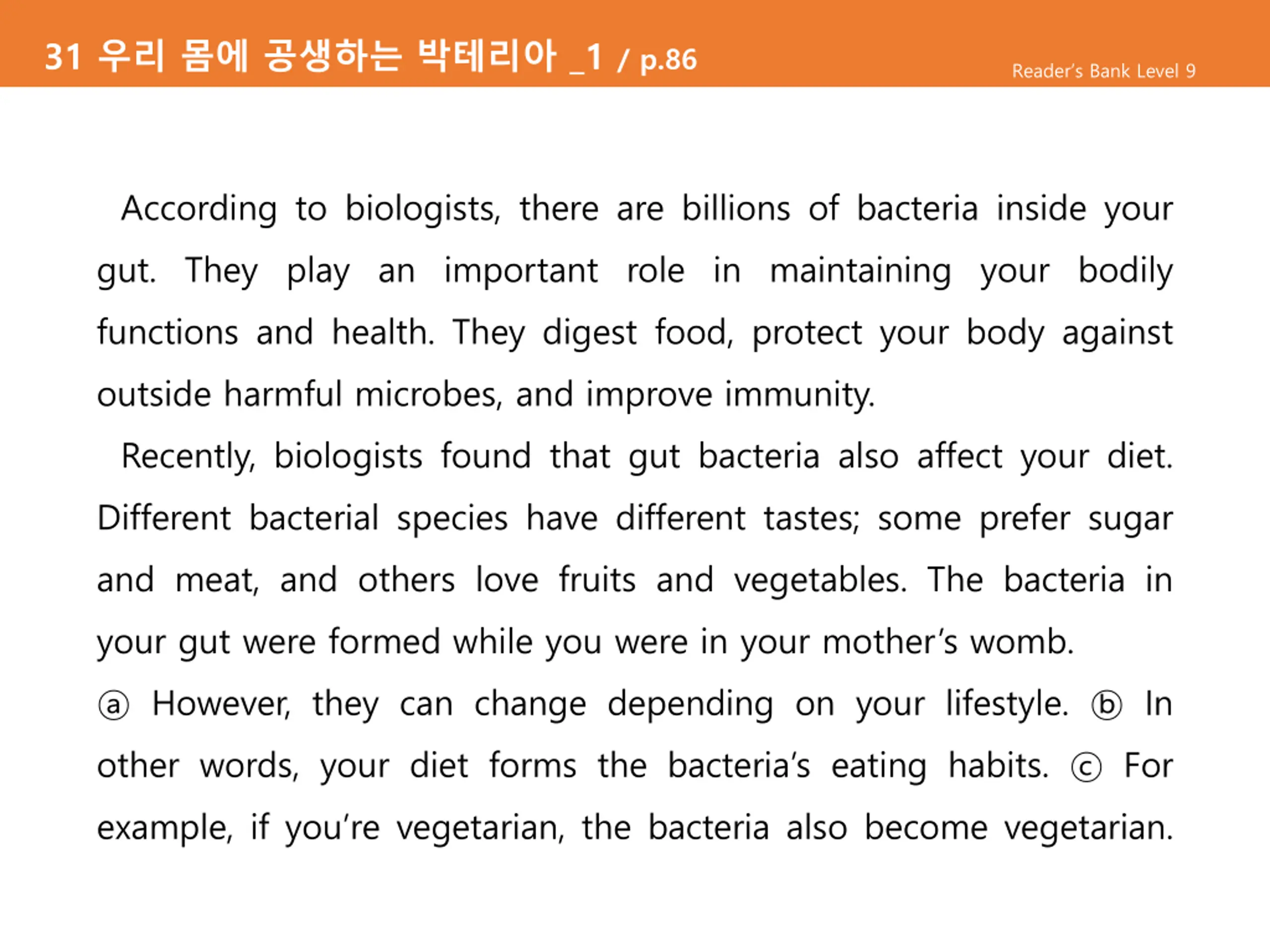 31 _1 / p.86 Reader s Bank Level 9 According to biologists, there are billions of bacteria inside your gut. They play an important role in maintaining your bodily functions and health. They digest food, protect your body against outside harmful microbes, and improve immunity. Recently, biologists found that gut bacteria also affect your diet. Different bacterial species have different tastes; some prefer sugar and meat, and others love fruits and vegetables. The bacteria in your gut were formed while you were in your mother s womb. However, they can change depending on your lifestyle. In other words, your diet forms the bacteria s eating habits. For example, if you re vegetarian, the bacteria also become vegetarian.