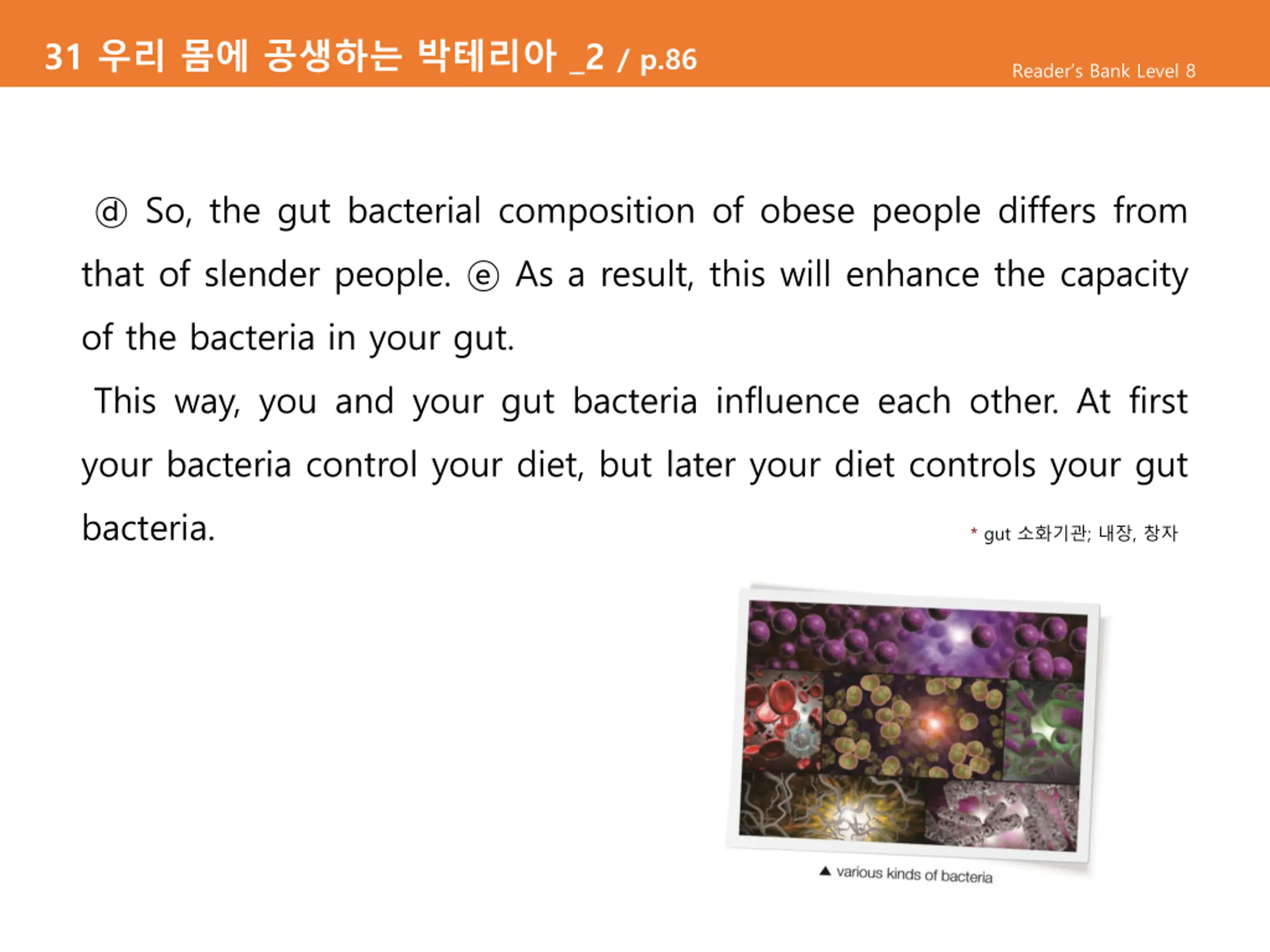 31 _2 / p.86 Reader s Bank Level 8 So, the gut bacterial composition of obese people differs from that of slender people. As a result, this will enhance the capacity of the bacteria in your gut. This way, you and your gut bacteria influence each other. At first your bacteria control your diet, but later your diet controls your gut bacteria. * gut ; ,