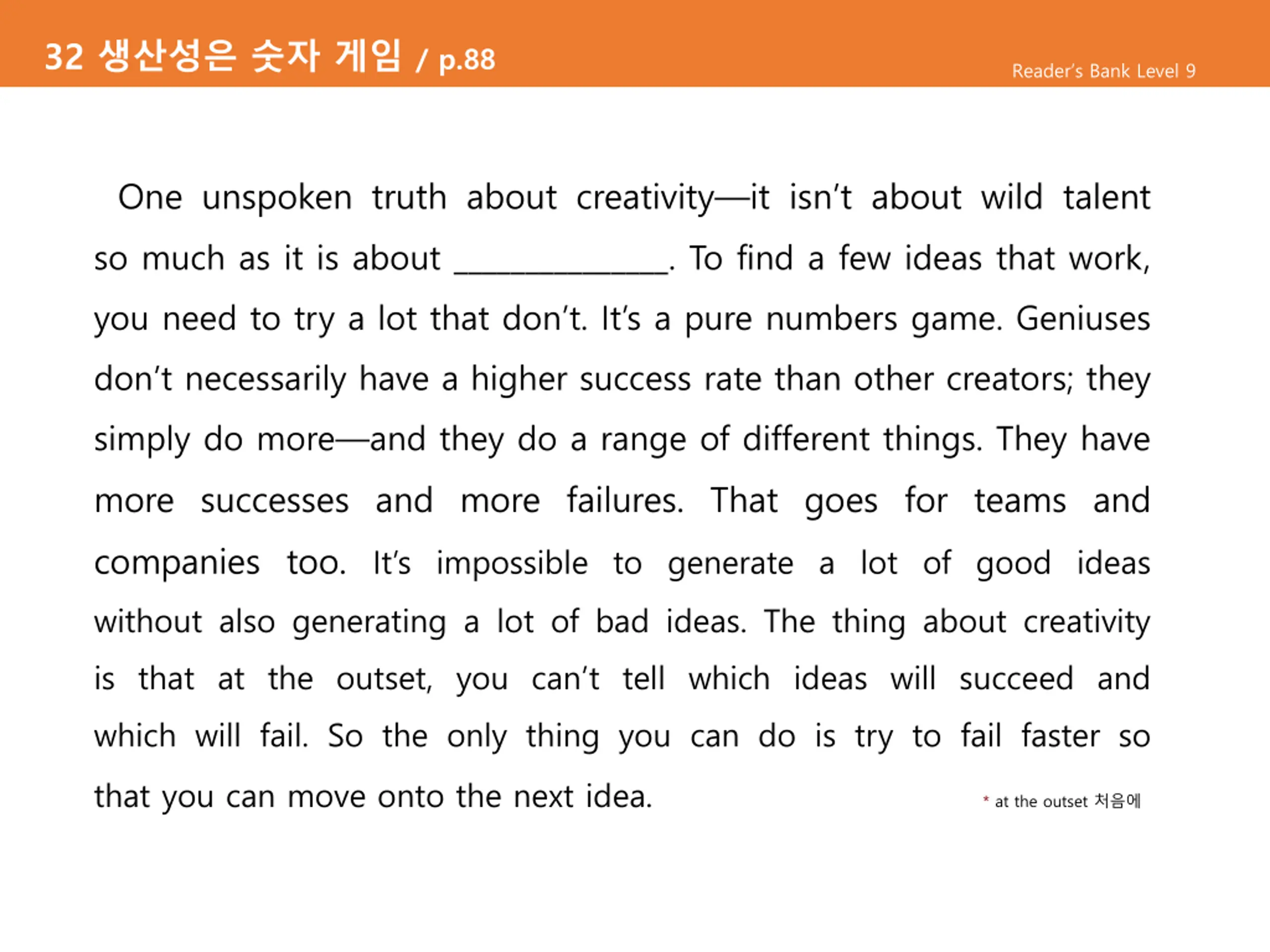 32 / p.88 Reader s Bank Level 9 One unspoken truth about creativity it isn t about wild talent so much as it is about _______________. To find a few ideas that work, you need to try a lot that don t. It s a pure numbers game. Geniuses don t necessarily have a higher success rate than other creators; they simply do more and they do a range of different things. They have more successes and more failures. That goes for teams and companies too. It s impossible to generate a lot of good ideas without also generating a lot of bad ideas. The thing about creativity is that at the outset, you can t tell which ideas will succeed and which will fail. So the only thing you can do is try to fail faster so that you can move onto the next idea. * at the outset