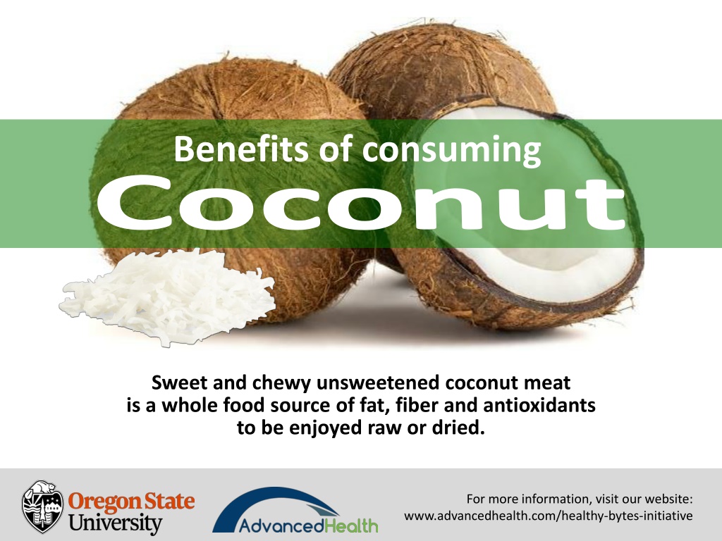 Benefits of consuming Coconut Sweet and chewy unsweetened coconut meat is a whole food source of fat, fiber and antioxidants to be enjoyed raw or dried. For more information, visit our website: www.advancedhealth.com/healthy-bytes-initiative