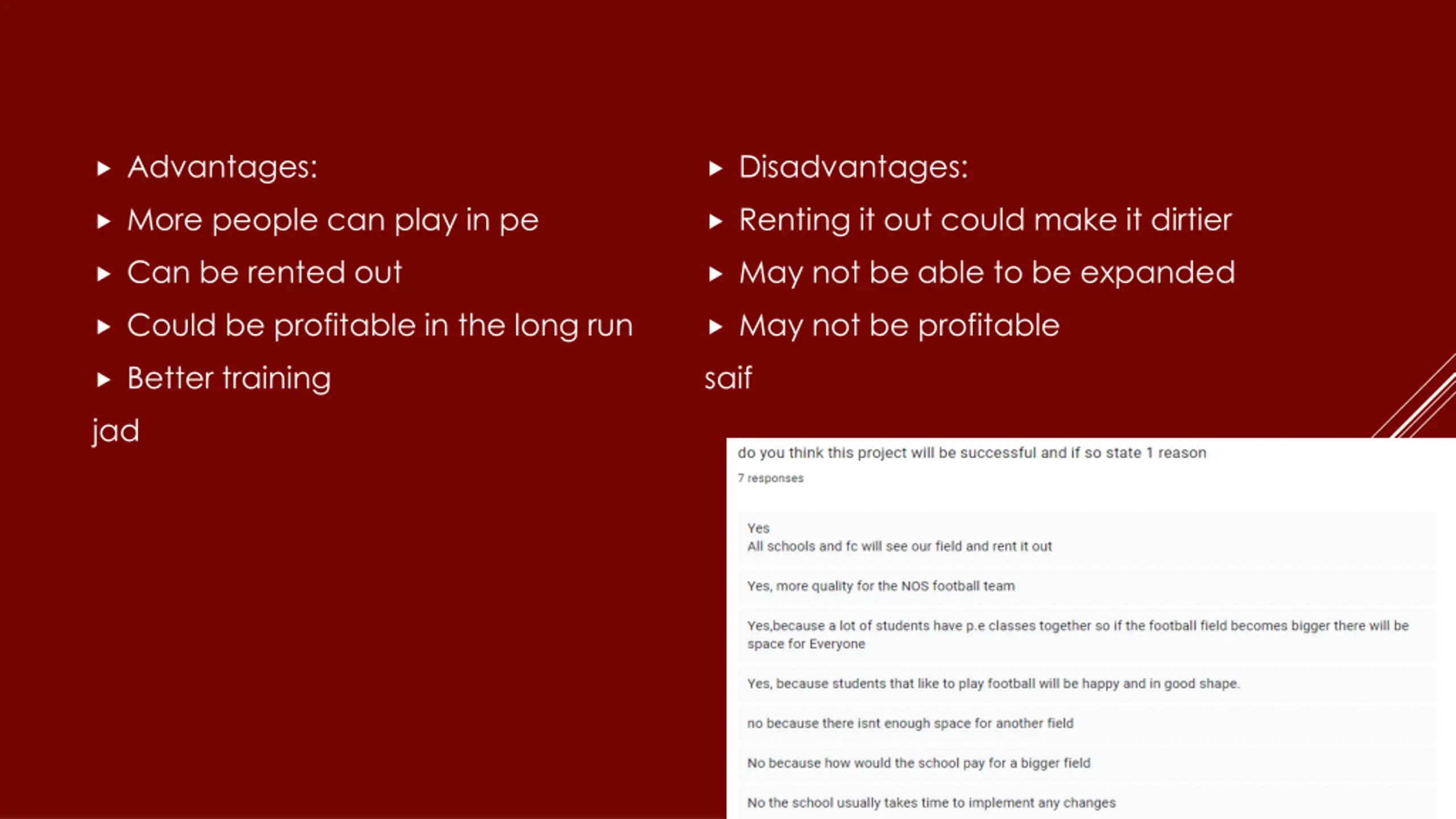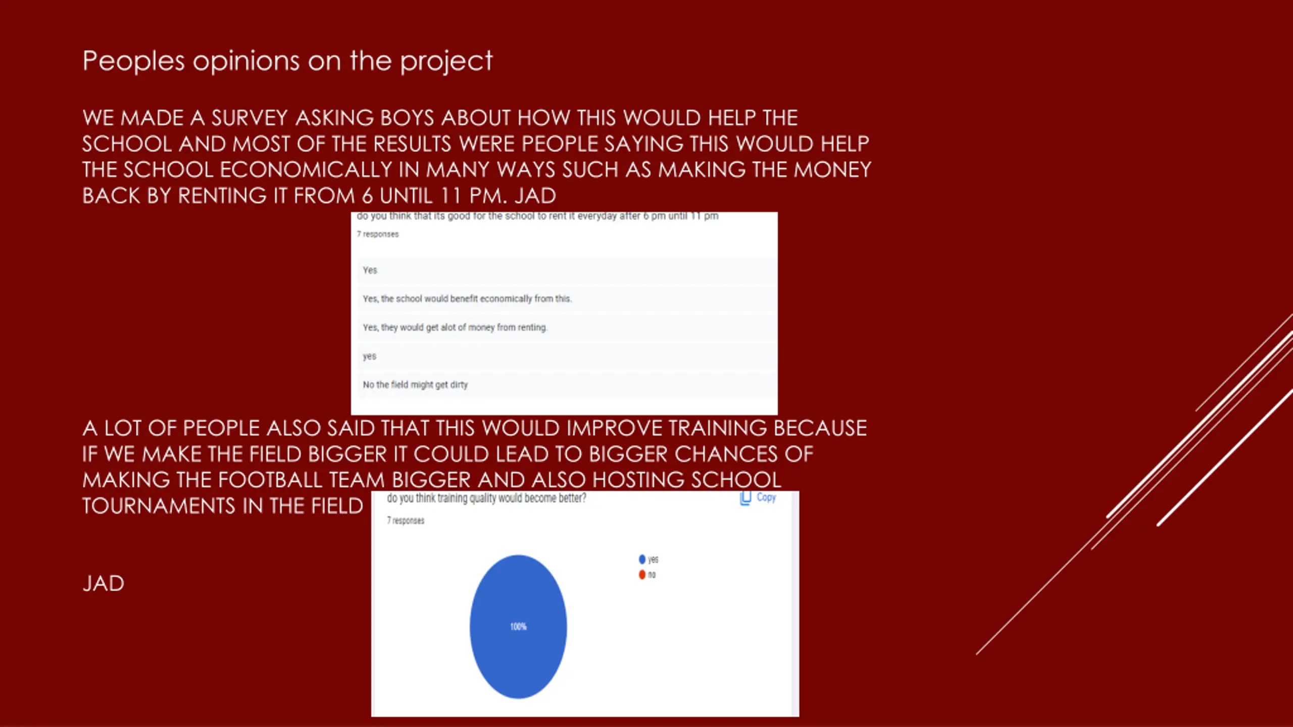 Peoples opinions on the project WE MADE A SURVEY ASKING BOYS ABOUT HOW THIS WOULD HELP THE SCHOOL AND MOST OF THE RESULTS WERE PEOPLE SAYING THIS WOULD HELP THE SCHOOL ECONOMICALLY IN MANY WAYS SUCH AS MAKING THE MONEY BACK BY RENTING IT FROM 6 UNTIL 11 PM. JAD A LOT OF PEOPLE ALSO SAID THAT THIS WOULD IMPROVE TRAINING BECAUSE IF WE MAKE THE FIELD BIGGER IT COULD LEAD TO BIGGER CHANCES OF MAKING THE FOOTBALL TEAM BIGGER AND ALSO HOSTING SCHOOL TOURNAMENTS IN THE FIELD JAD