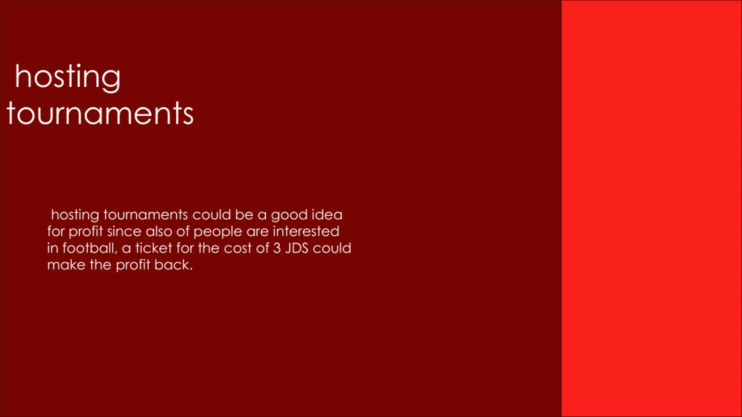 hosting tournaments hosting tournaments could be a good idea for profit since also of people are interested in football, a ticket for the cost of 3 JDS could make the profit back.