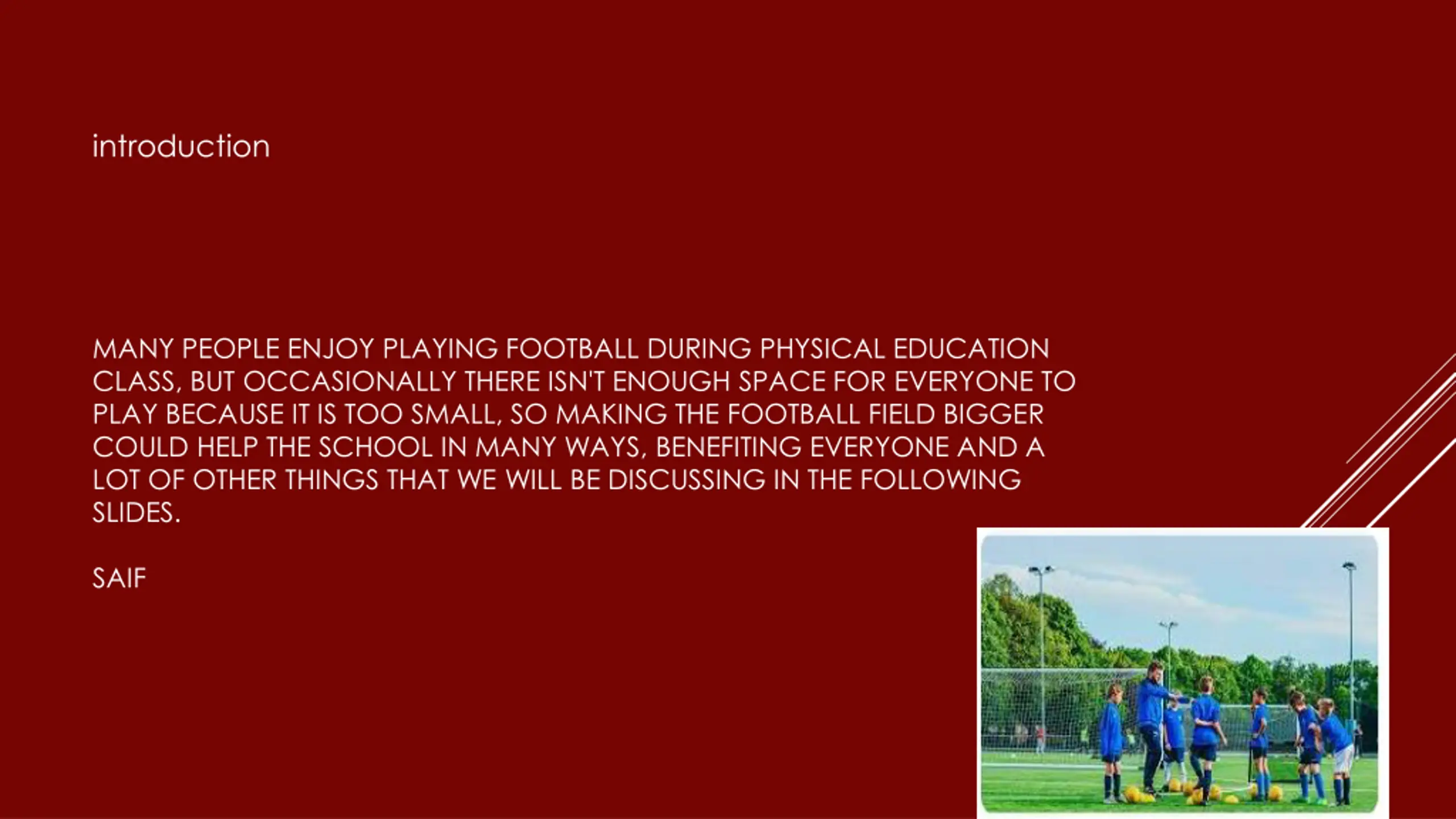 introduction MANY PEOPLE ENJOY PLAYING FOOTBALL DURING PHYSICAL EDUCATION CLASS, BUT OCCASIONALLY THERE ISN'T ENOUGH SPACE FOR EVERYONE TO PLAY BECAUSE IT IS TOO SMALL, SO MAKING THE FOOTBALL FIELD BIGGER COULD HELP THE SCHOOL IN MANY WAYS, BENEFITING EVERYONE AND A LOT OF OTHER THINGS THAT WE WILL BE DISCUSSING IN THE FOLLOWING SLIDES. SAIF