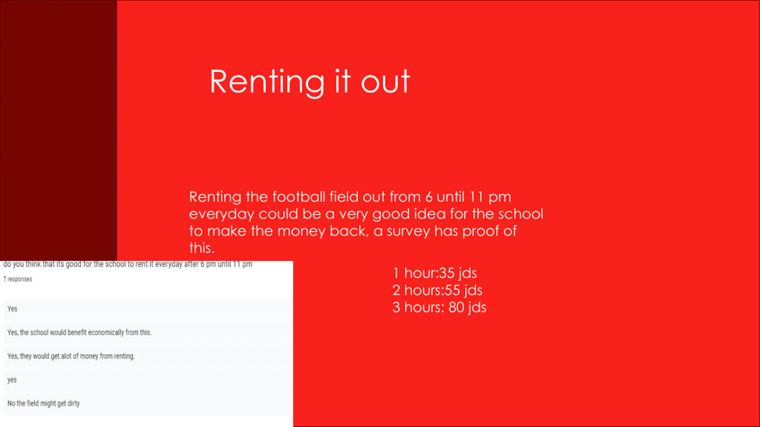 Renting it out Renting the football field out from 6 until 11 pm everyday could be a very good idea for the school to make the money back, a survey has proof of this. 1 hour:35 jds 2 hours:55 jds 3 hours: 80 jds