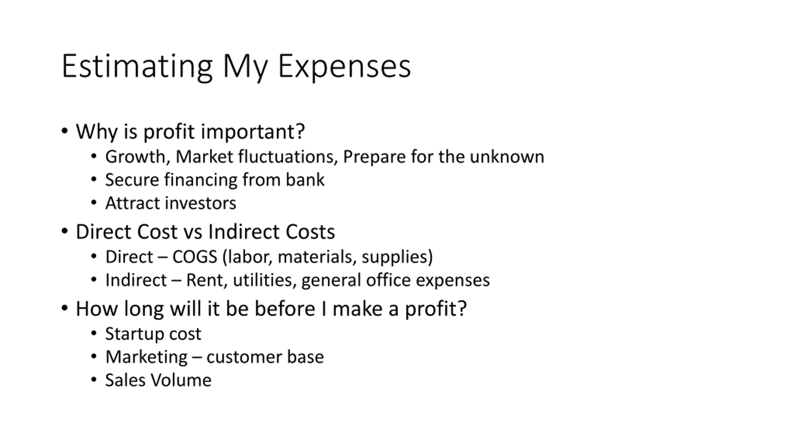 Estimating My Expenses Why is profit important? Growth, Market fluctuations, Prepare for the unknown Secure financing from bank Attract investors Direct Cost vs Indirect Costs Direct COGS (labor, materials, supplies) Indirect Rent, utilities, general office expenses How long will it be before I make a profit? Startup cost Marketing customer base Sales Volume