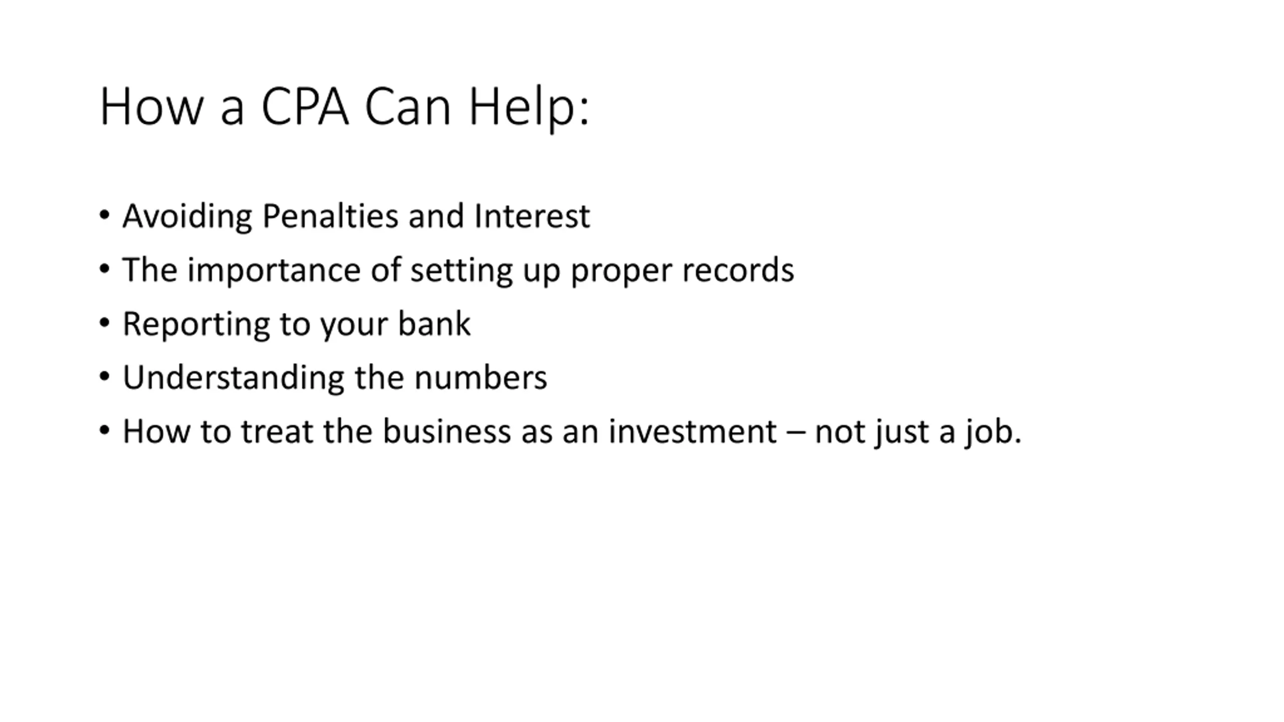 How a CPA Can Help: Avoiding Penalties and Interest The importance of setting up proper records Reporting to your bank Understanding the numbers How to treat the business as an investment not just a job.