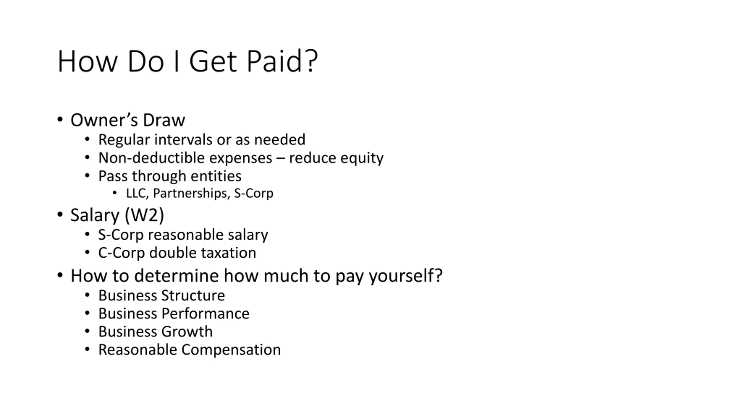 How Do I Get Paid? Owner s Draw Regular intervals or as needed Non-deductible expenses reduce equity Pass through entities LLC, Partnerships, S-Corp Salary (W2) S-Corp reasonable salary C-Corp double taxation How to determine how much to pay yourself? Business Structure Business Performance Business Growth Reasonable Compensation
