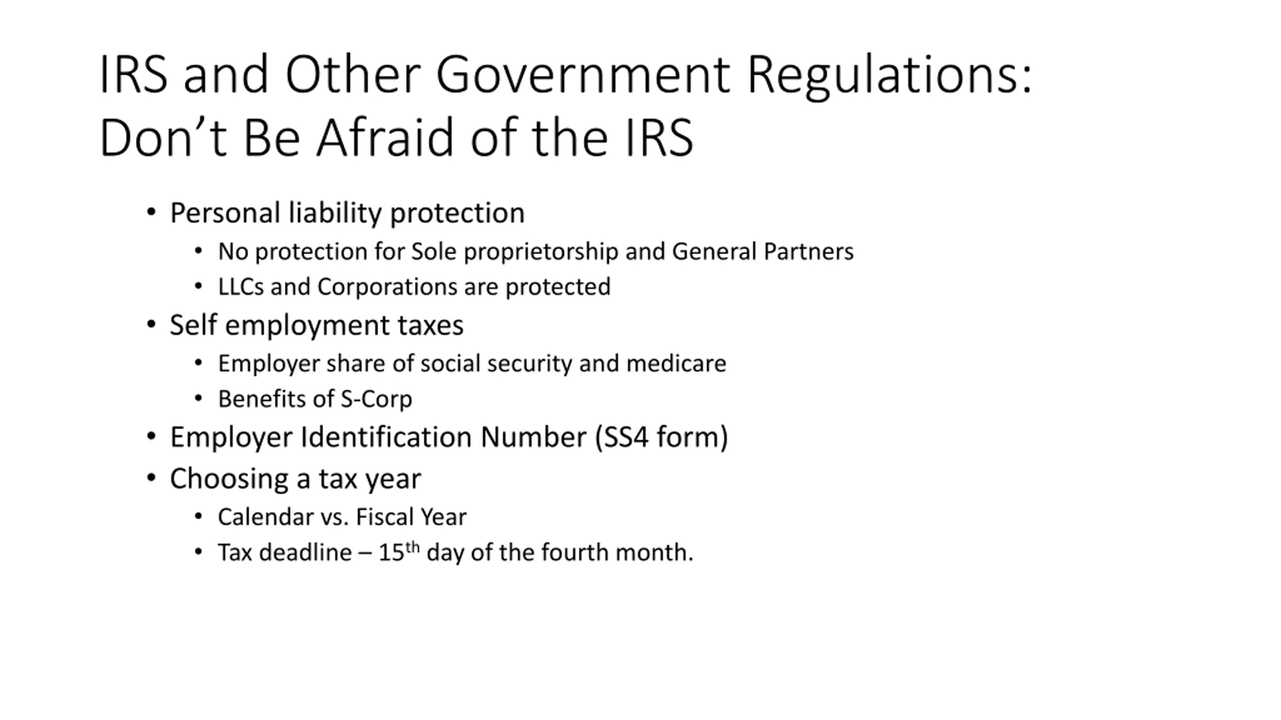 IRS and Other Government Regulations: Don t Be Afraid of the IRS Personal liability protection No protection for Sole proprietorship and General Partners LLCs and Corporations are protected Self employment taxes Employer share of social security and medicare Benefits of S-Corp Employer Identification Number (SS4 form) Choosing a tax year Calendar vs. Fiscal Year Tax deadline 15thday of the fourth month.