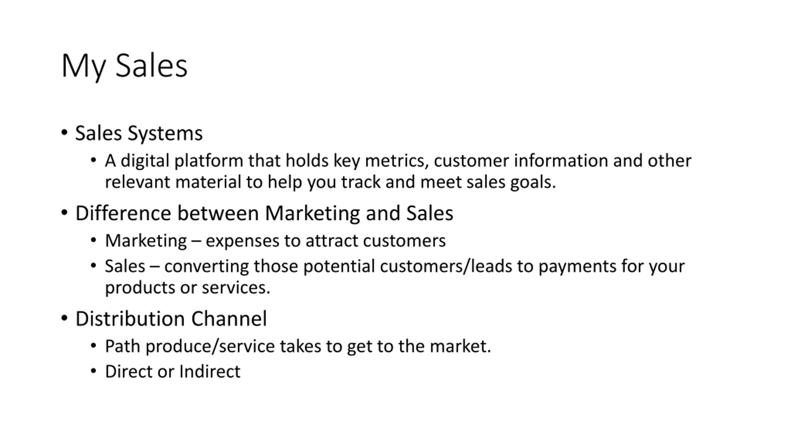 My Sales Sales Systems A digital platform that holds key metrics, customer information and other relevant material to help you track and meet sales goals. Difference between Marketing and Sales Marketing expenses to attract customers Sales converting those potential customers/leads to payments for your products or services. Distribution Channel Path produce/service takes to get to the market. Direct or Indirect