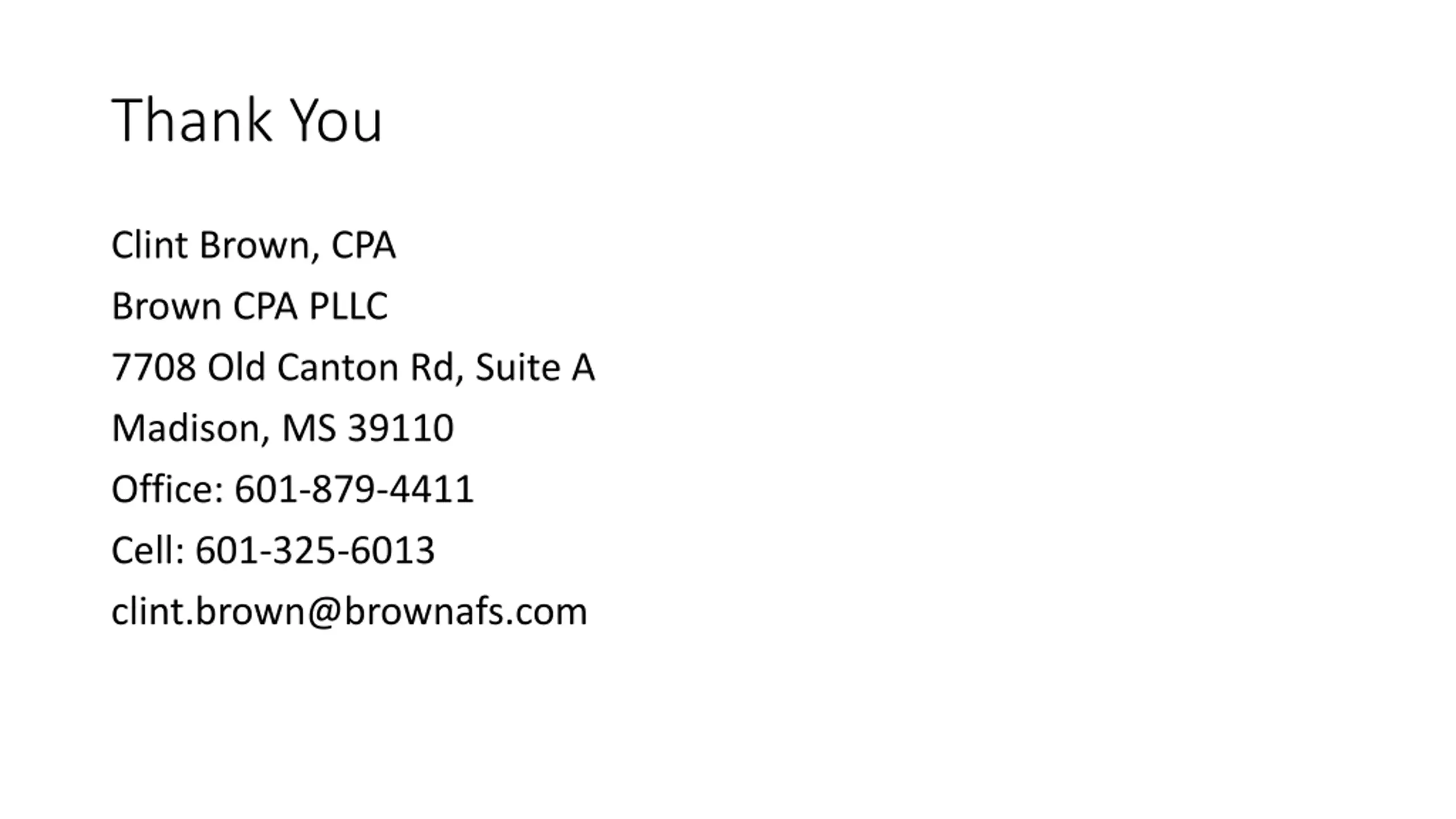 Thank You Clint Brown, CPA Brown CPA PLLC 7708 Old Canton Rd, Suite A Madison, MS 39110 Office: 601-879-4411 Cell: 601-325-6013 clint.brown@brownafs.com