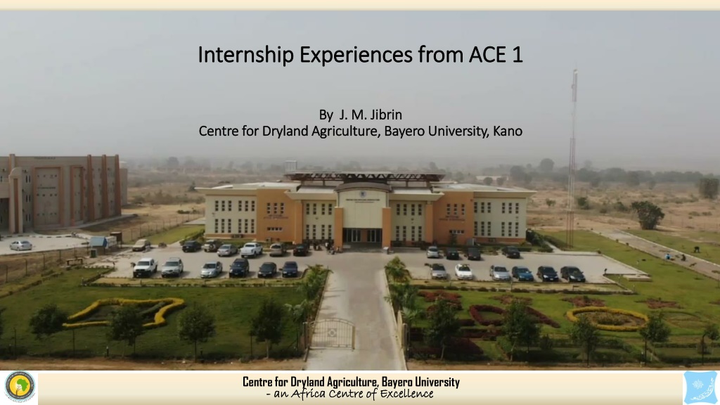 Internship Experiences from ACE 1 Internship Experiences from ACE 1 By J. M. Jibrin By J. M. Jibrin Centre for Dryland Agriculture, Bayero University, Kano Centre for Dryland Agriculture, Bayero University, Kano Centre for Dryland Agriculture, Bayero University - - an Africa Centre of Excellence an Africa Centre of Excellence - - an Africa Centre of Excellence an Africa Centre of Excellence Centre for Dryland Agriculture, Bayero University 3/20/2025 3/20/2025 3/20/2025 1 1 1