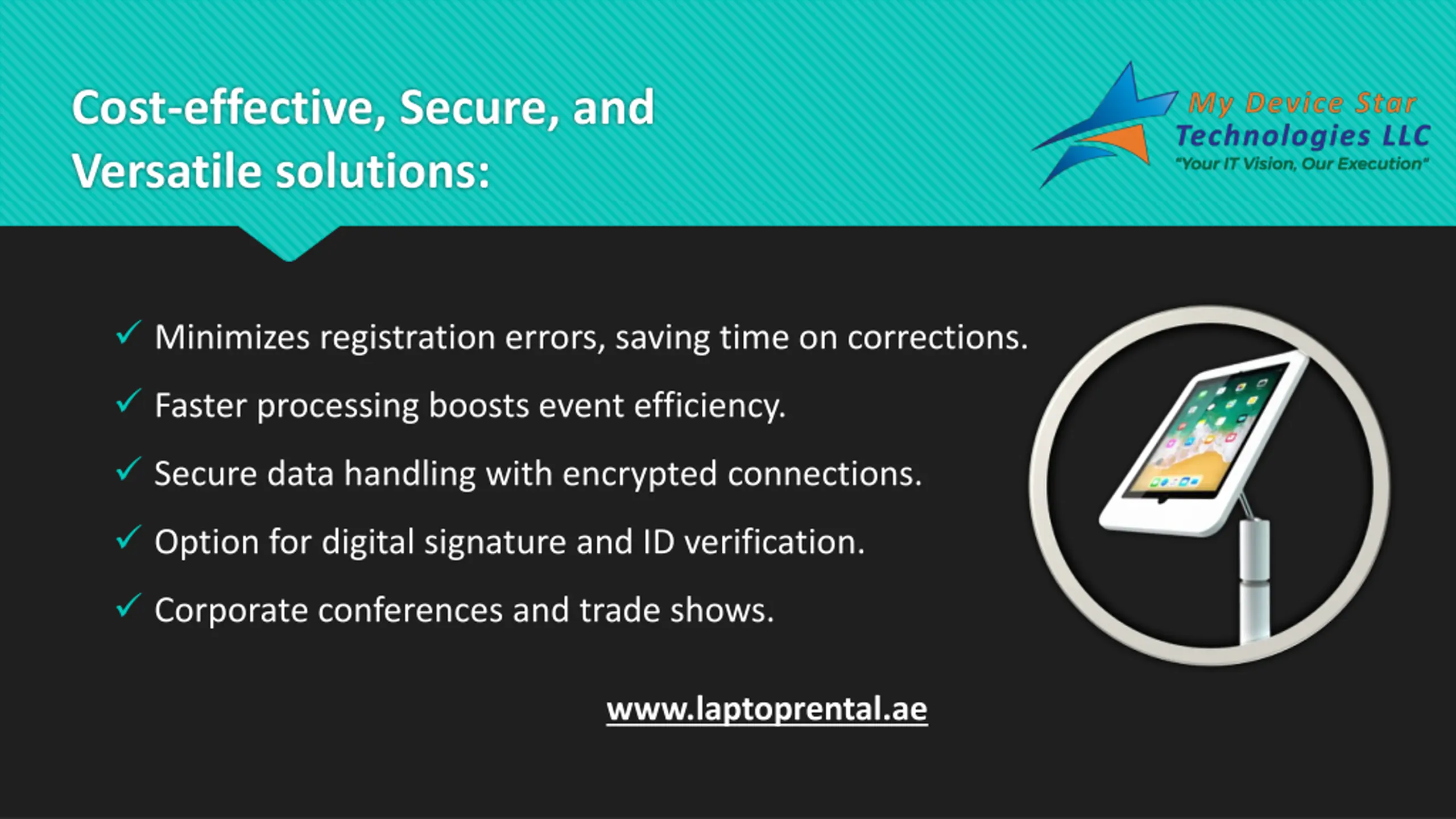 Cost-effective, Secure, and Versatile solutions: Minimizes registration errors, saving time on corrections. Faster processing boosts event efficiency. Secure data handling with encrypted connections. Option for digital signature and ID verification. Corporate conferences and trade shows. www.laptoprental.ae