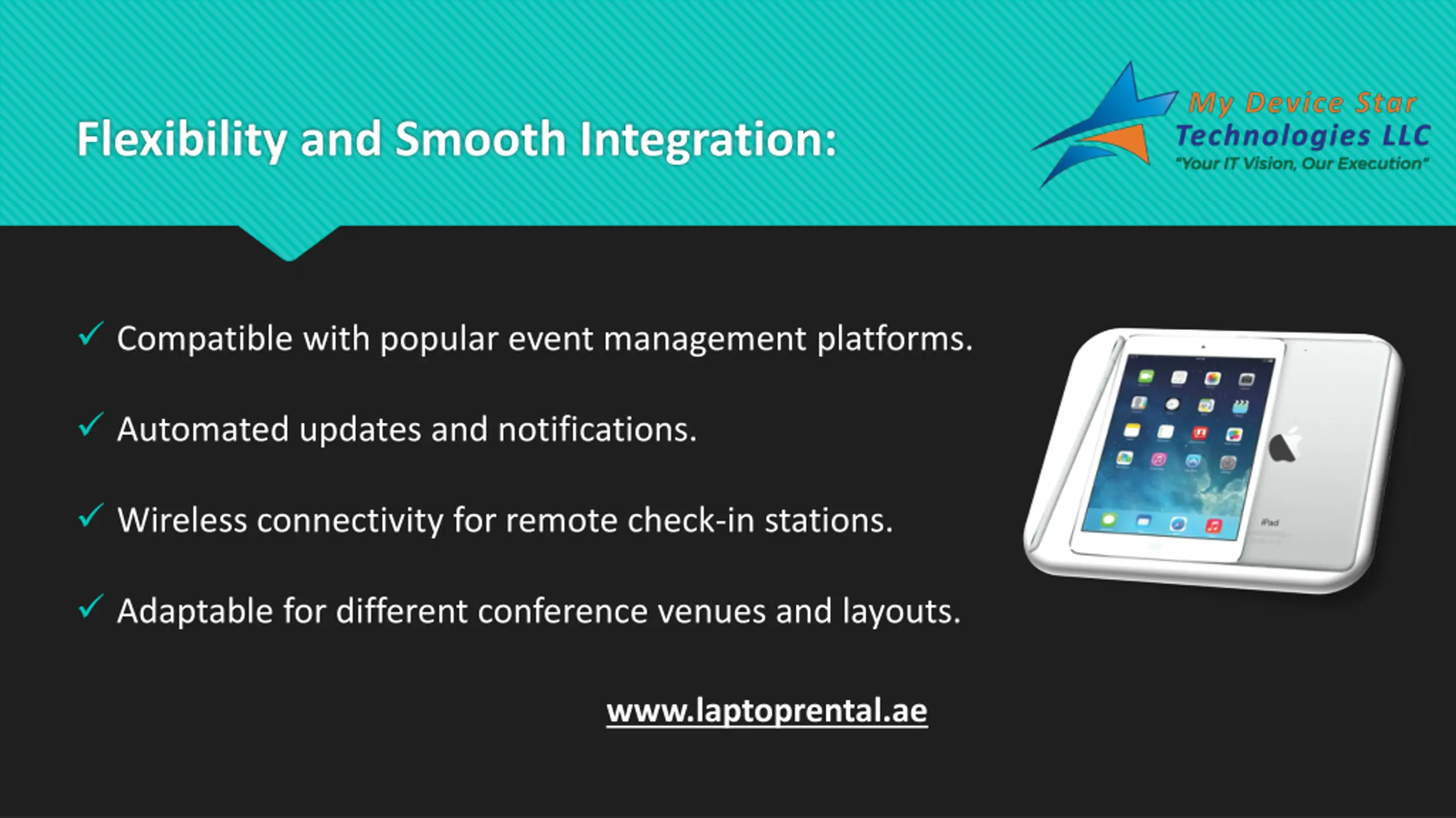Flexibility and Smooth Integration: Compatible with popular event management platforms. Automated updates and notifications. Wireless connectivity for remote check-in stations. Adaptable for different conference venues and layouts. www.laptoprental.ae
