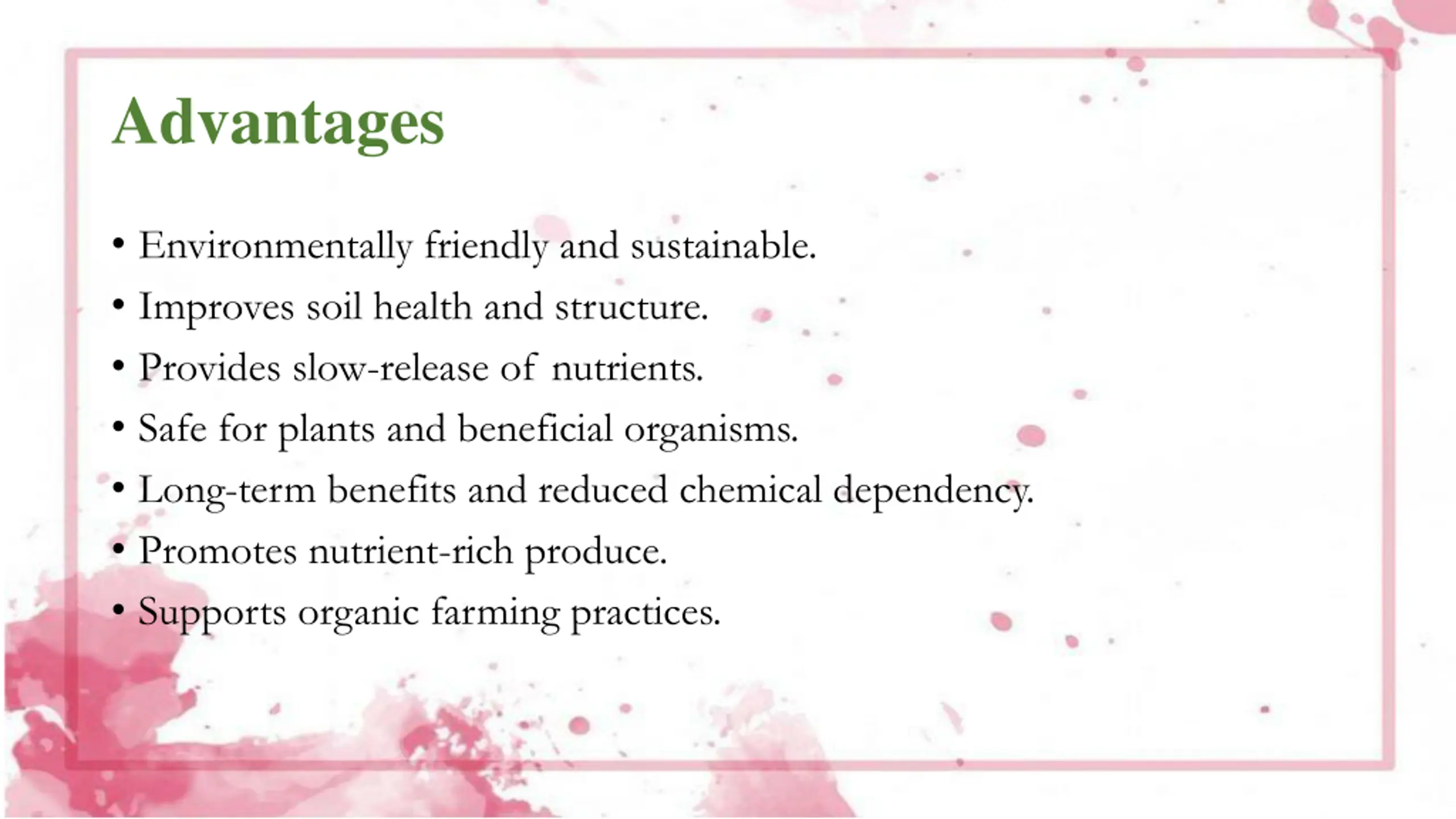 Advantages Environmentally friendly and sustainable. Improves soil health and structure. Provides slow-release of nutrients. Safe for plants and beneficial organisms. Long-term benefits and reduced chemical dependency. Promotes nutrient-rich produce. Supports organic farming practices.