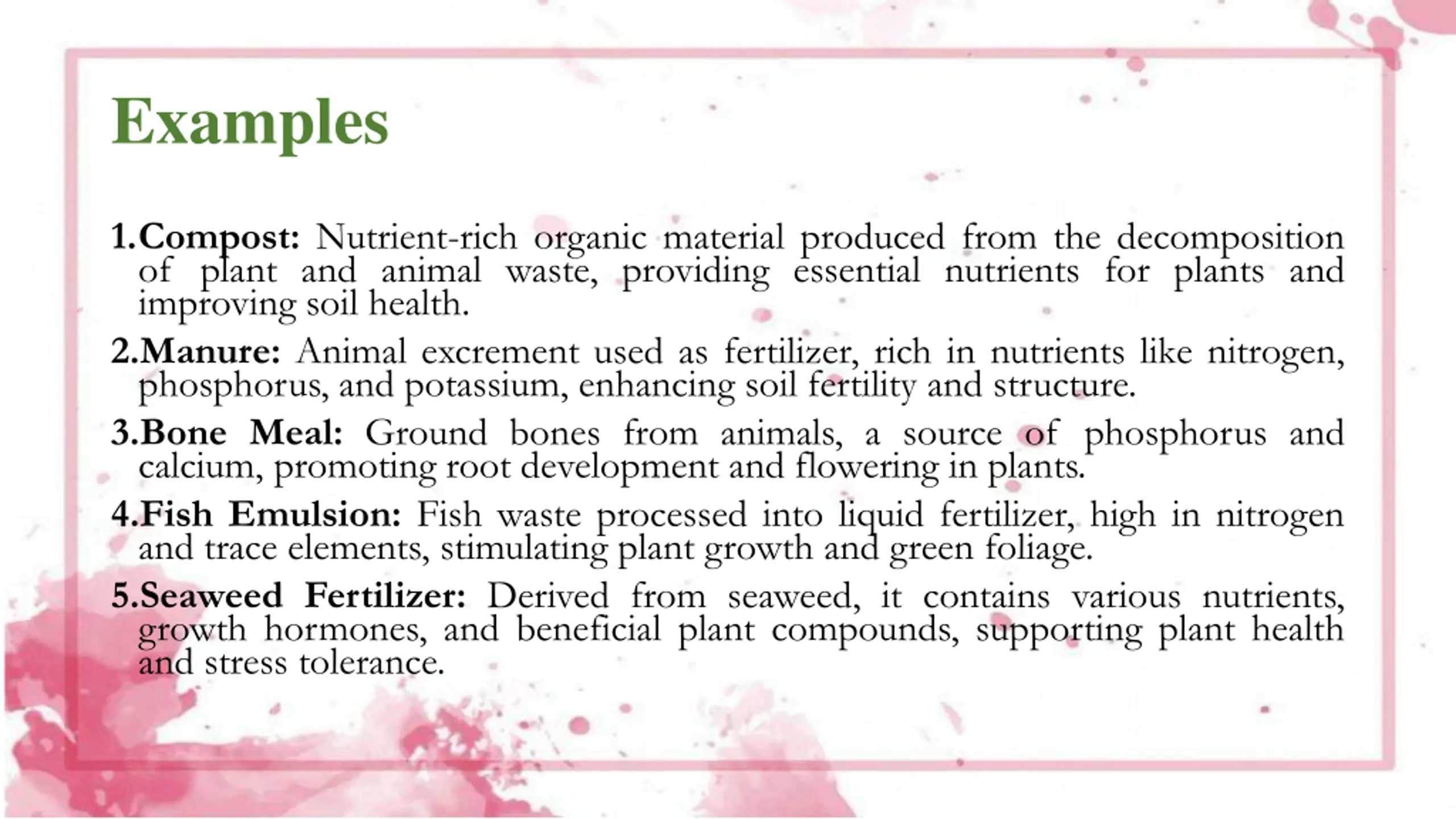 Examples 1.Compost: Nutrient-rich organic material produced from the decomposition of plant and animal waste, providing essential nutrients for plants and improving soil health. 2.Manure: Animal excrement used as fertilizer, rich in nutrients like nitrogen, phosphorus, and potassium, enhancing soil fertility and structure. 3.Bone Meal: Ground bones from animals, a source of phosphorus and calcium, promoting root development and flowering in plants. 4.Fish Emulsion: Fish waste processed into liquid fertilizer, high in nitrogen and trace elements, stimulating plant growth and green foliage. 5.Seaweed Fertilizer: Derived from seaweed, it contains various nutrients, growth hormones, and beneficial plant compounds, supporting plant health and stress tolerance.