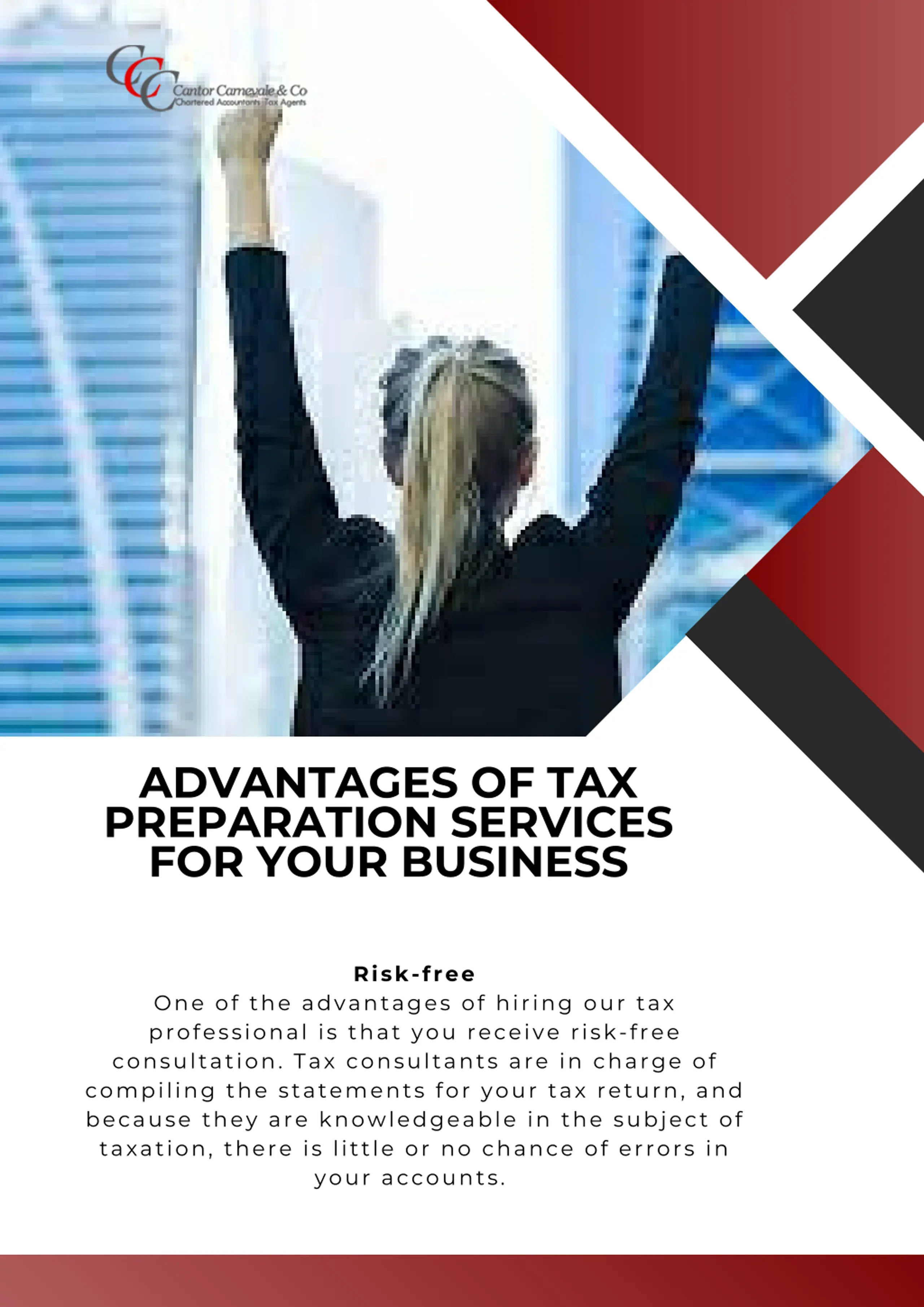 ADVANTAGES OF TAX PREPARATION SERVICES FOR YOUR BUSINESS Risk-free One of the advantages of hiring our tax professional is that you receive risk-free consultation. Tax consultants are in charge of compiling the statements for your tax return, and because they are knowledgeable in the subject of taxation, there is little or no chance of errors in your accounts.