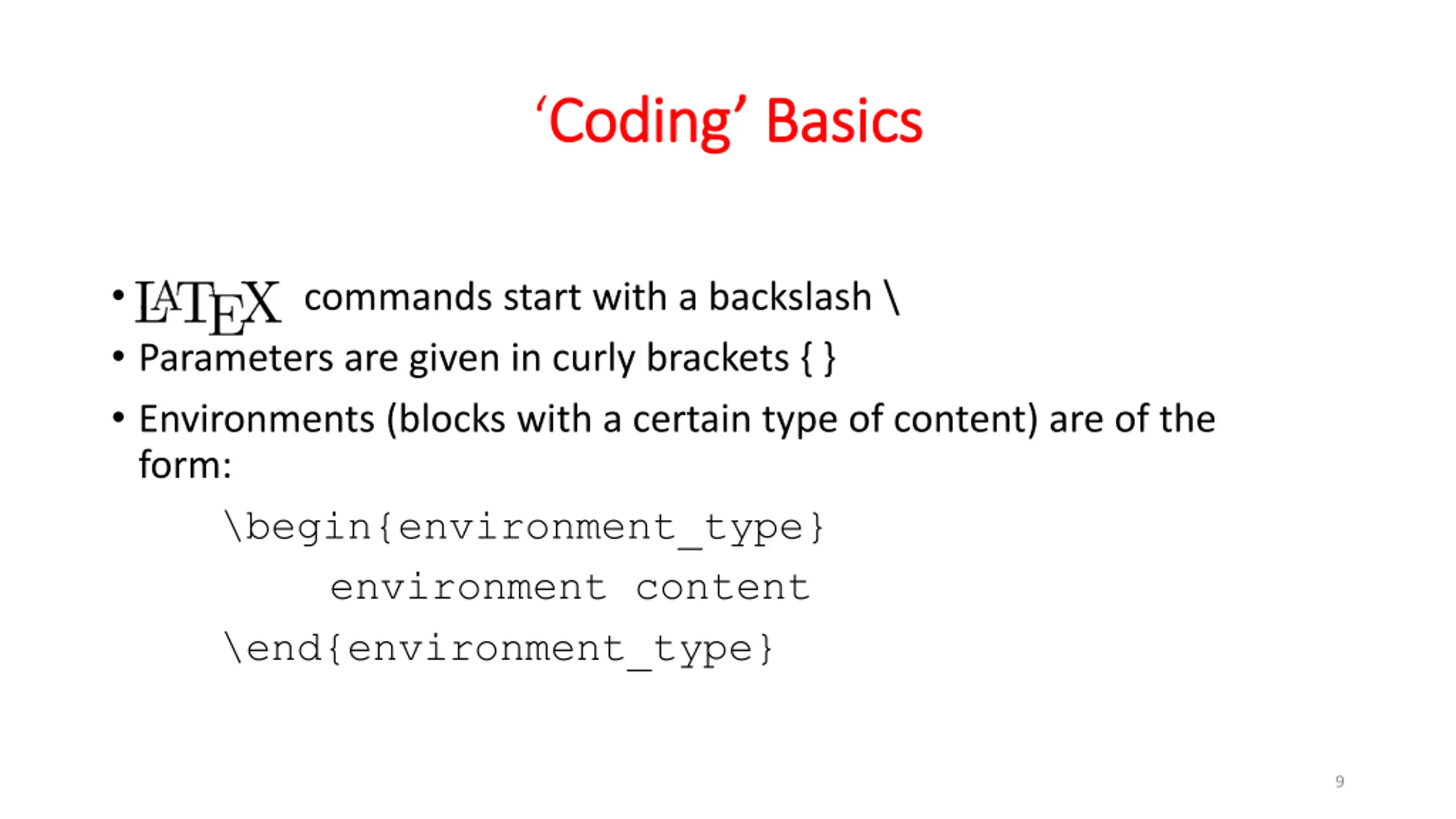 Coding Basics Coding Basics . commands start with a backslash \ Parameters are given in curly brackets { } Environments (blocks with a certain type of content) are of the form: \begin{environment_type} environment content \end{environment_type} 9