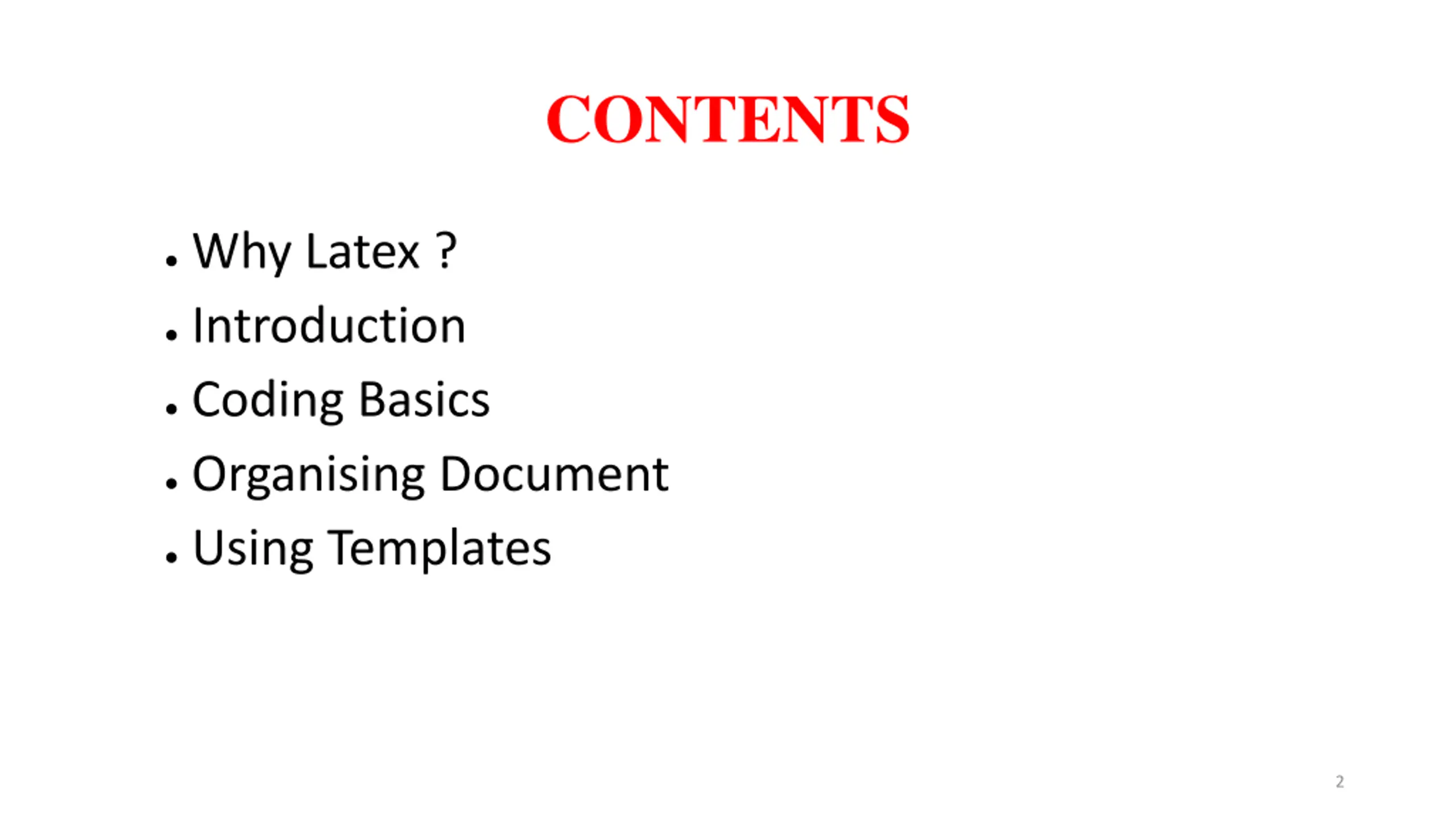 CONTENTS Why Latex ? Introduction Coding Basics Organising Document Using Templates 2