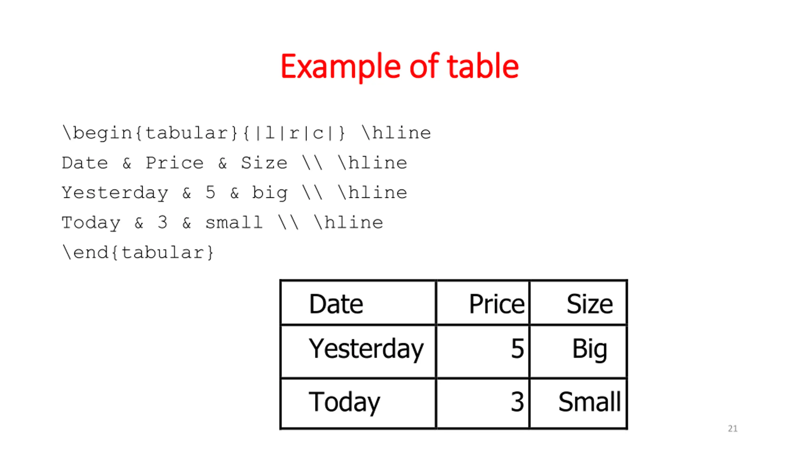 Example of table Example of table \begin{tabular}{|l|r|c|} \hline Date & Price & Size \\ \hline Yesterday & 5 & big \\ \hline Today & 3 & small \\ \hline \end{tabular} Date Yesterday Price Size Big 5 Today 3 Small 21