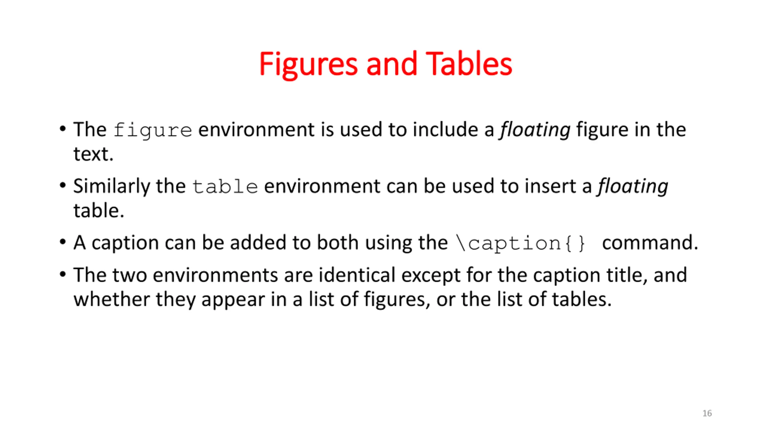 Figures and Tables Figures and Tables The figure environment is used to include a floating figure in the text. Similarly the table environment can be used to insert a floating table. A caption can be added to both using the \caption{} command. The two environments are identical except for the caption title, and whether they appear in a list of figures, or the list of tables. 16