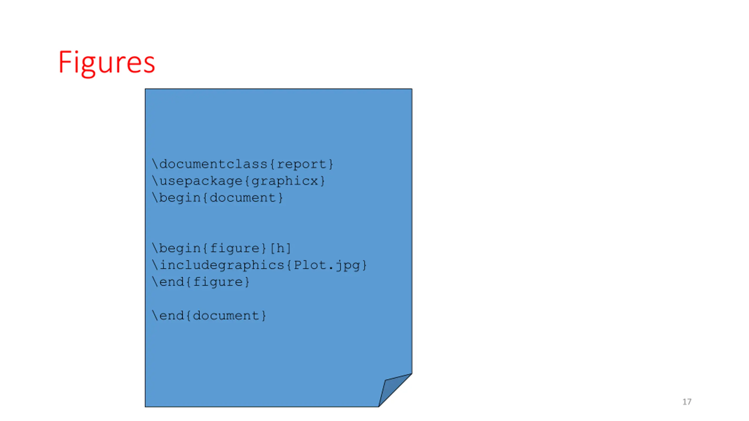 Figures \documentclass{report} \usepackage{graphicx} \begin{document} \begin{figure}[h] \includegraphics{Plot.jpg} \end{figure} \end{document} 17