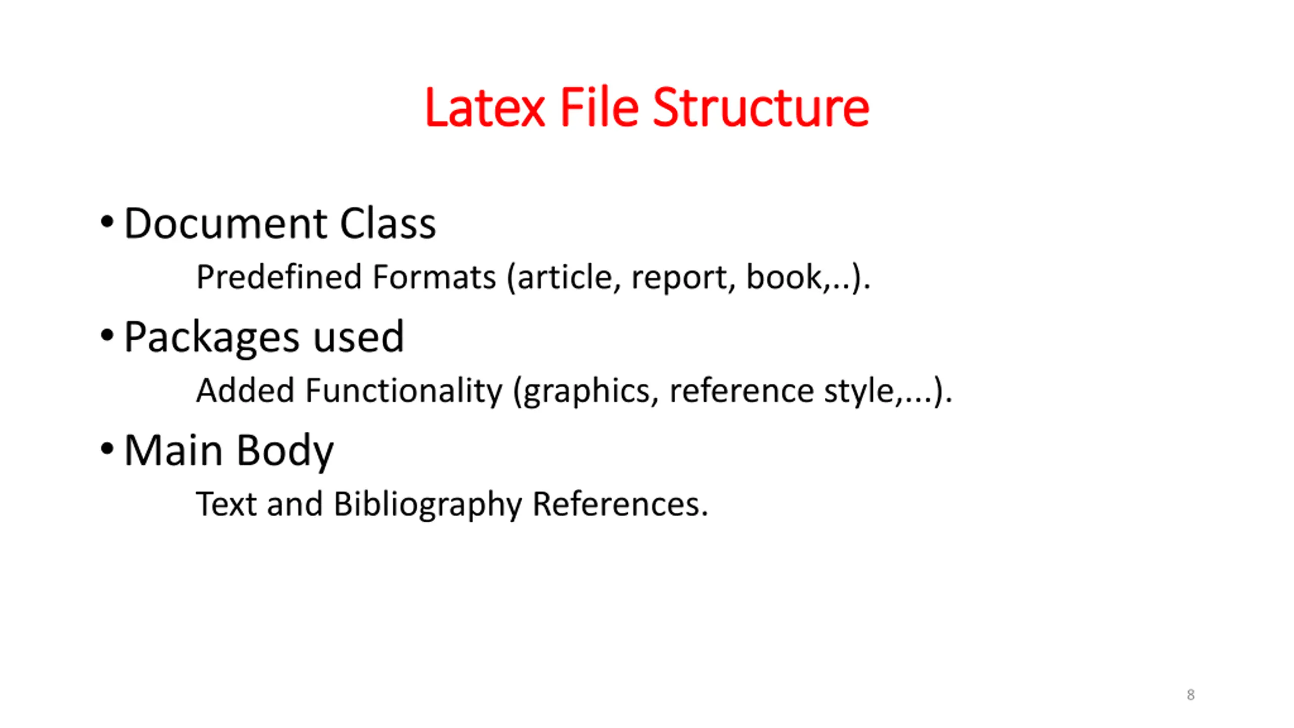 Latex File Structure Latex File Structure Document Class Predefined Formats (article, report, book,..). Packages used Added Functionality (graphics, reference style,...). Main Body Text and Bibliography References. 8
