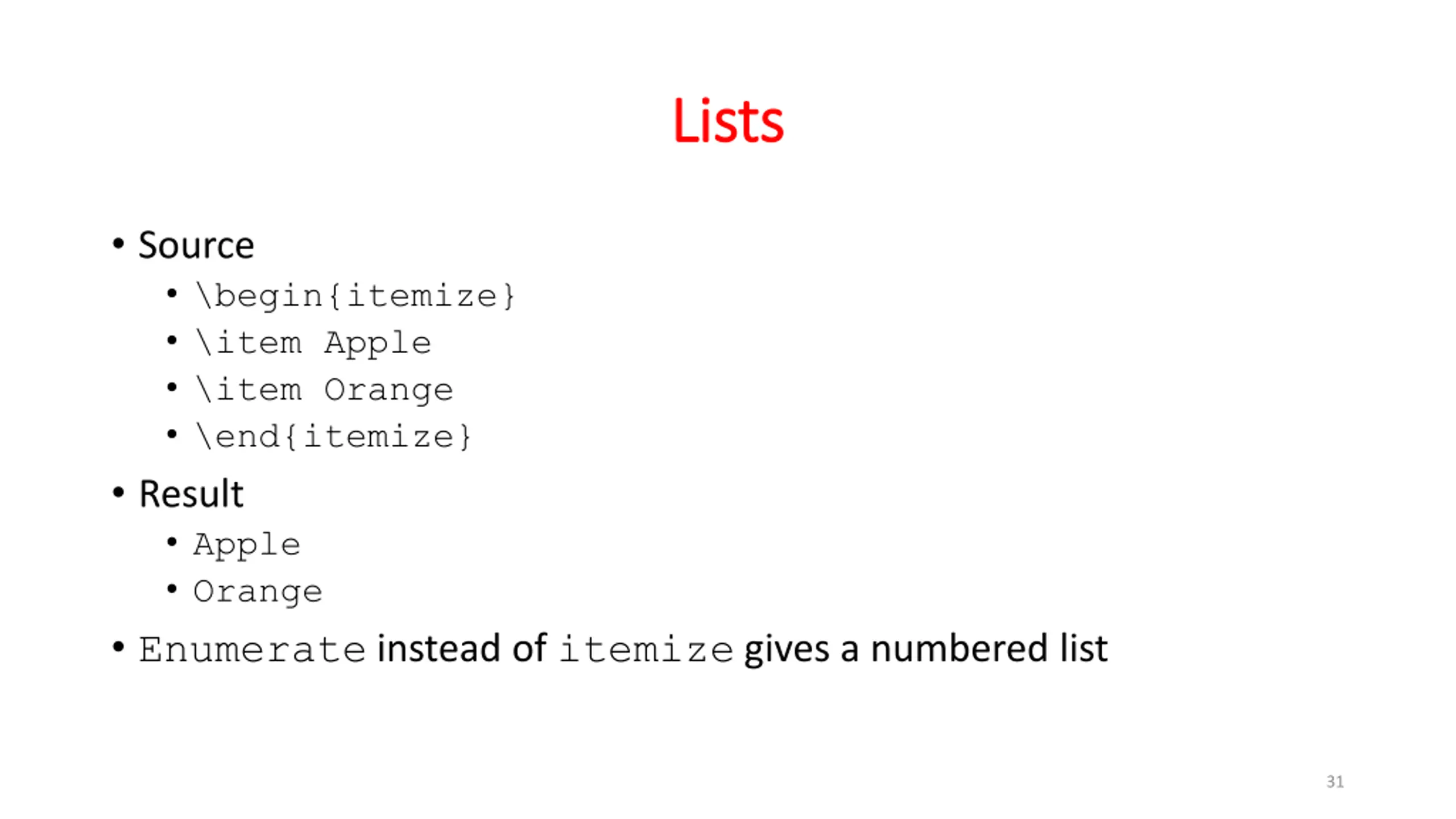 Lists Lists Source \begin{itemize} \item Apple \item Orange \end{itemize} Result Apple Orange Enumerate instead of itemize gives a numbered list 31