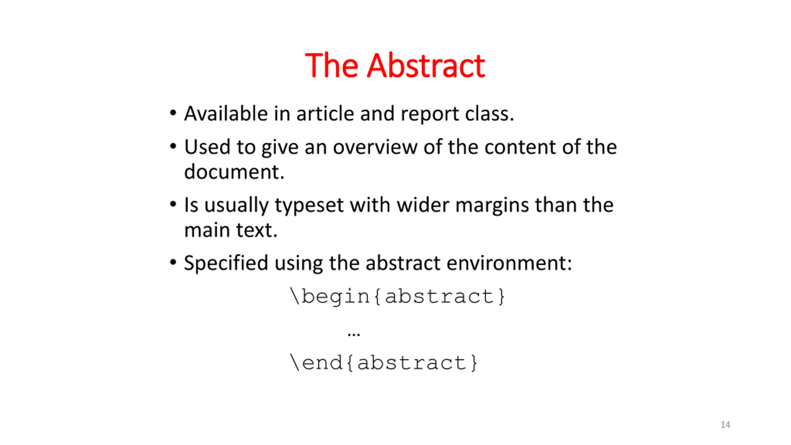 The Abstract The Abstract Available in article and report class. Used to give an overview of the content of the document. Is usually typeset with wider margins than the main text. Specified using the abstract environment: \begin{abstract} \end{abstract} 14