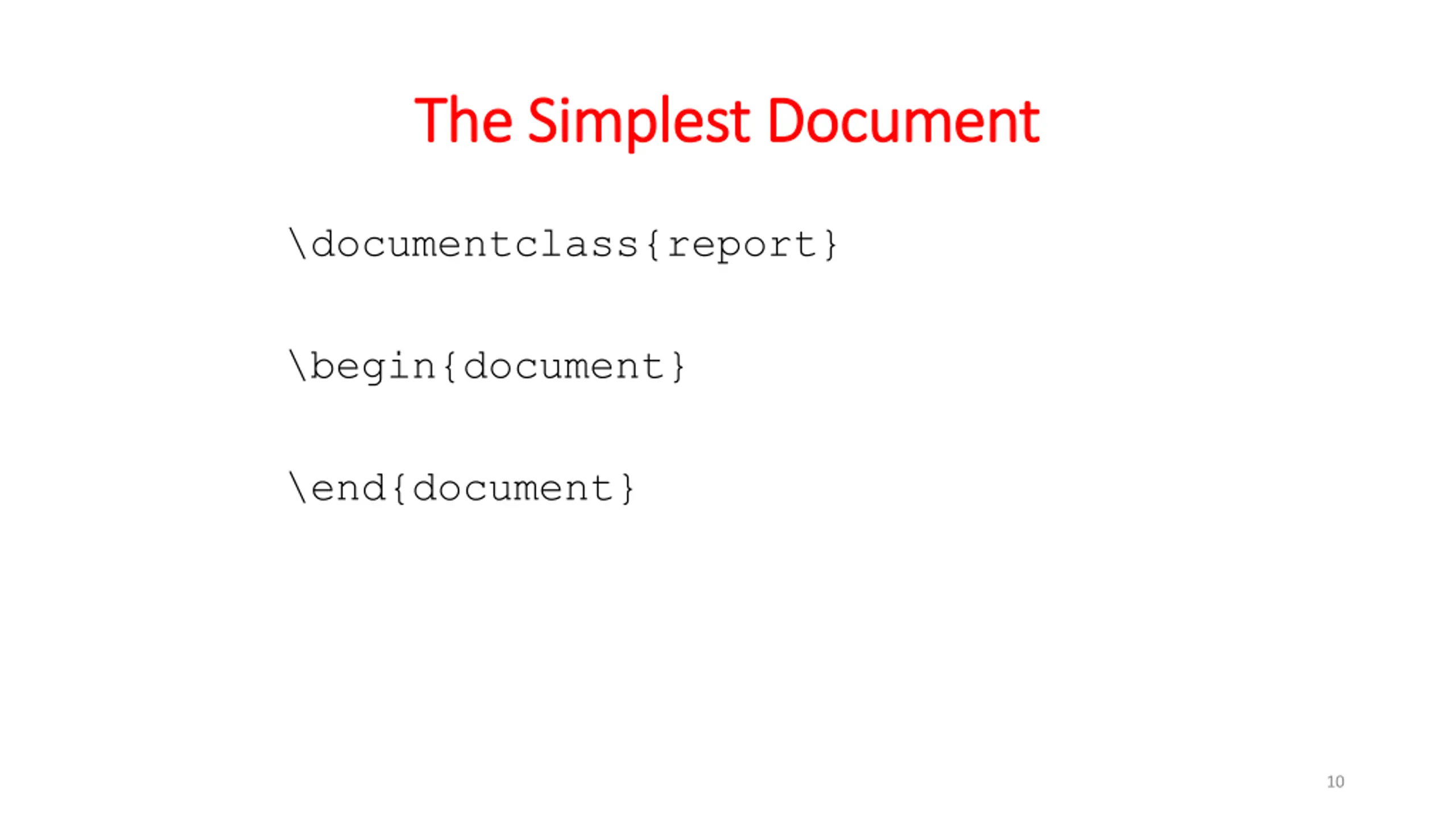 The Simplest Document The Simplest Document \documentclass{report} \begin{document} \end{document} 10