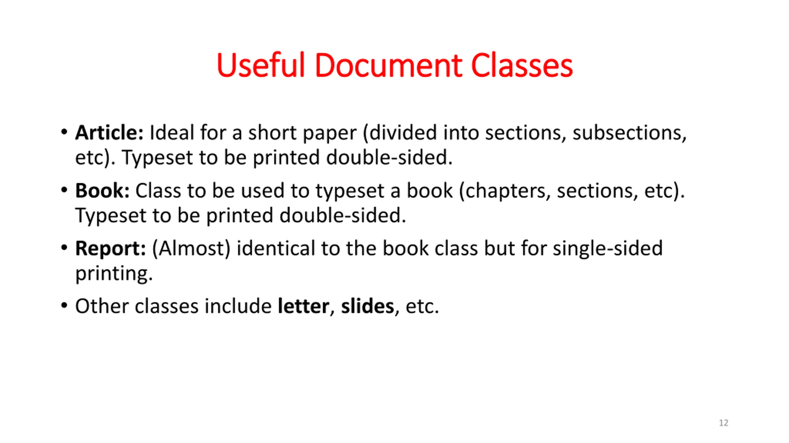 Useful Document Classes Useful Document Classes Article: Ideal for a short paper (divided into sections, subsections, etc). Typeset to be printed double-sided. Book: Class to be used to typeset a book (chapters, sections, etc). Typeset to be printed double-sided. Report: (Almost) identical to the book class but for single-sided printing. Other classes include letter, slides, etc. 12