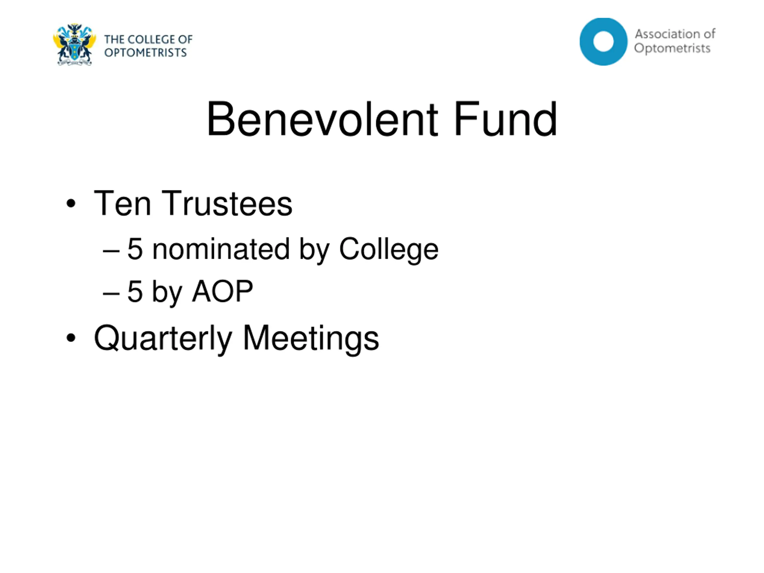 Keeping people in the optometric profession We paid AOP fees for 10 beneficiaries We paid GOC fees for 8 beneficiaries who still practice The College kindly waives its annual fees for many of our beneficiaries