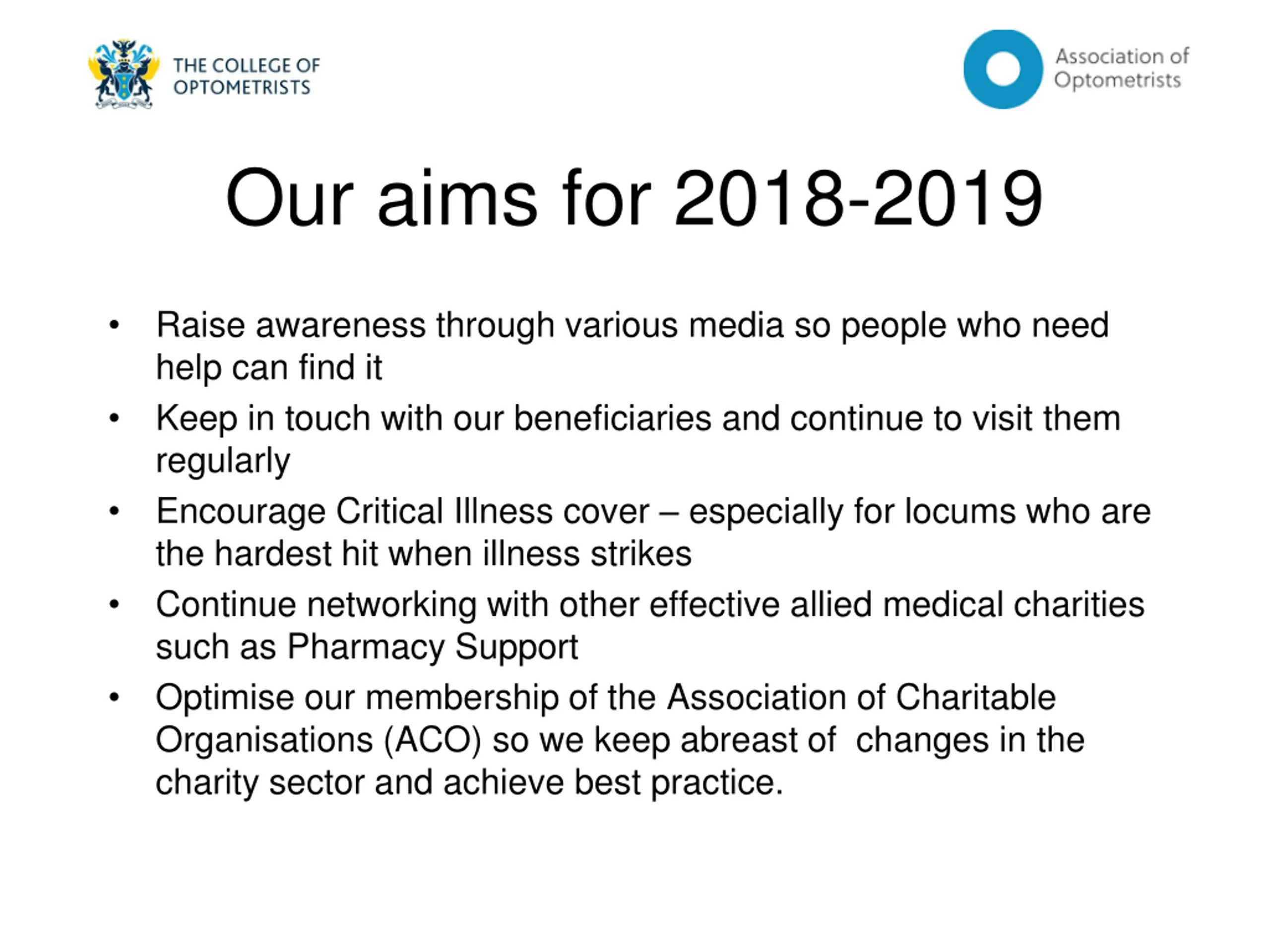Our aims for 2018-2019 Raise awareness through various media so people who need help can find it Keep in touch with our beneficiaries and continue to visit them regularly Encourage Critical Illness cover especially for locums who are the hardest hit when illness strikes Continue networking with other effective allied medical charities such as Pharmacy Support Optimise our membership of the Association of Charitable Organisations (ACO) so we keep abreast of changes in the charity sector and achieve best practice.