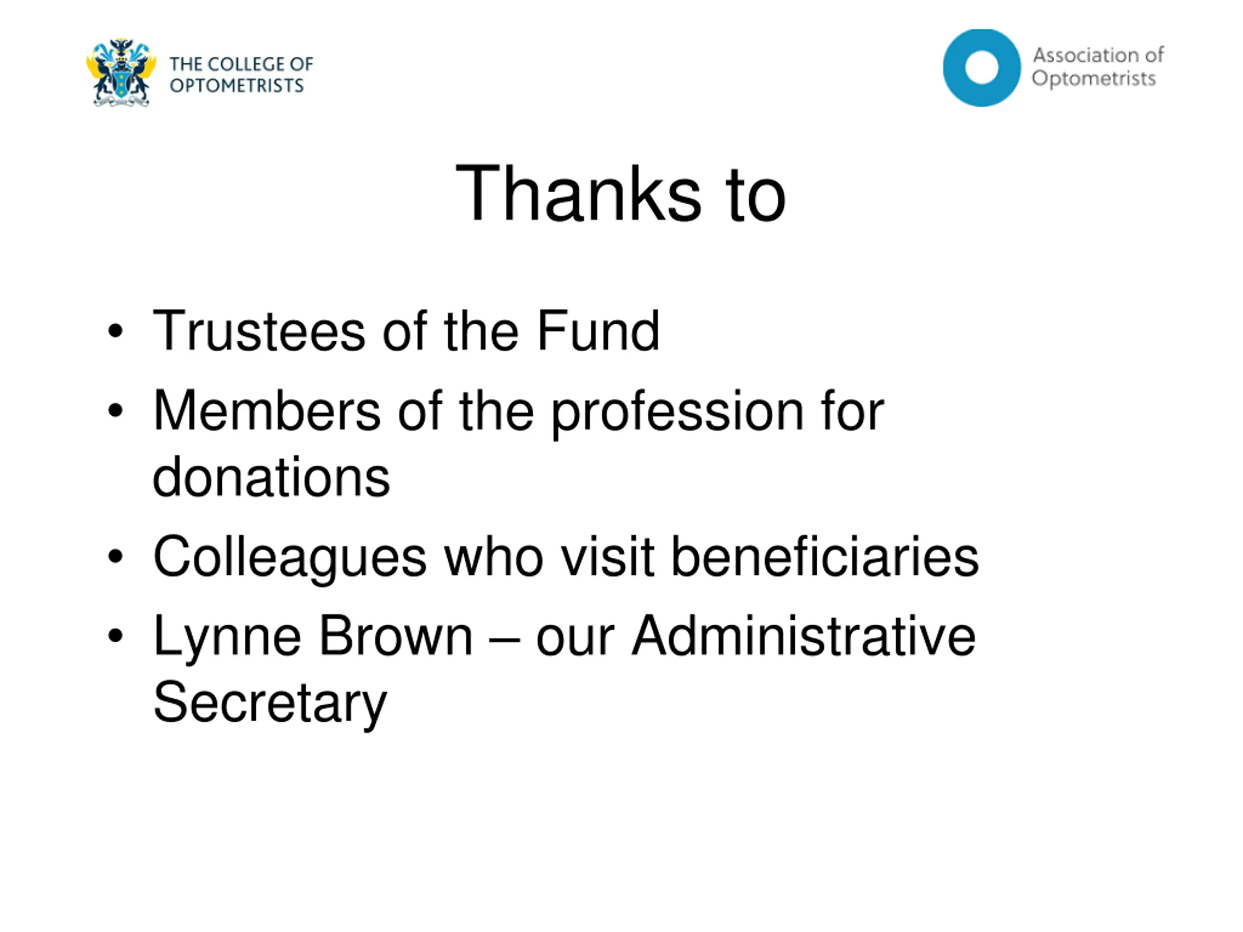 Thanks to Trustees of the Fund Members of the profession for donations Colleagues who visit beneficiaries Lynne Brown our Administrative Secretary