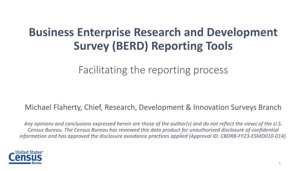 Business Enterprise Research and Development Survey (BERD) Reporting Tools Facilitating the reporting process Michael Flaherty, Chief, Research, Development & Innovation Surveys Branch Any opinions and conclusions expressed herein are those of the author(s) and do not reflect the views of the U.S. Census Bureau. The Census Bureau has reviewed this data product for unauthorized disclosure of confidential information and has approved the disclosure avoidance practices applied (Approval ID: CBDRB-FY23-ESMD010-014). 1