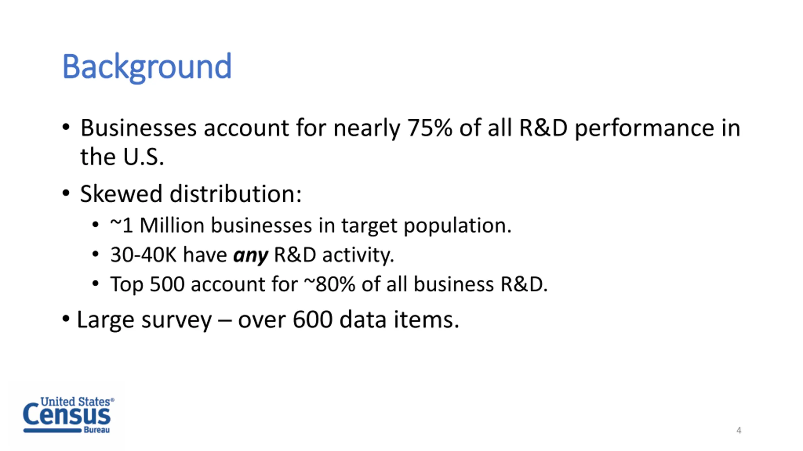 Background Background Businesses account for nearly 75% of all R&D performance in the U.S. Skewed distribution: ~1 Million businesses in target population. 30-40K have any R&D activity. Top 500 account for ~80% of all business R&D. Large survey over 600 data items. 4