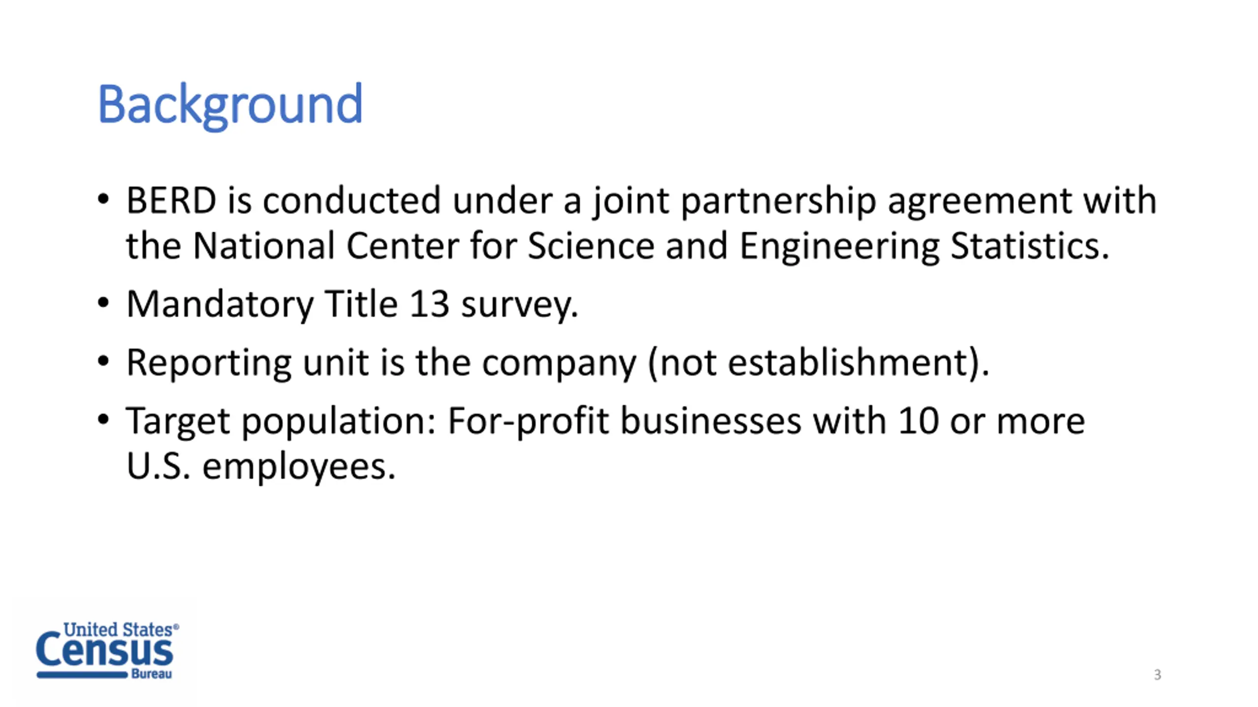 Background Background BERD is conducted under a joint partnership agreement with the National Center for Science and Engineering Statistics. Mandatory Title 13 survey. Reporting unit is the company (not establishment). Target population: For-profit businesses with 10 or more U.S. employees. 3