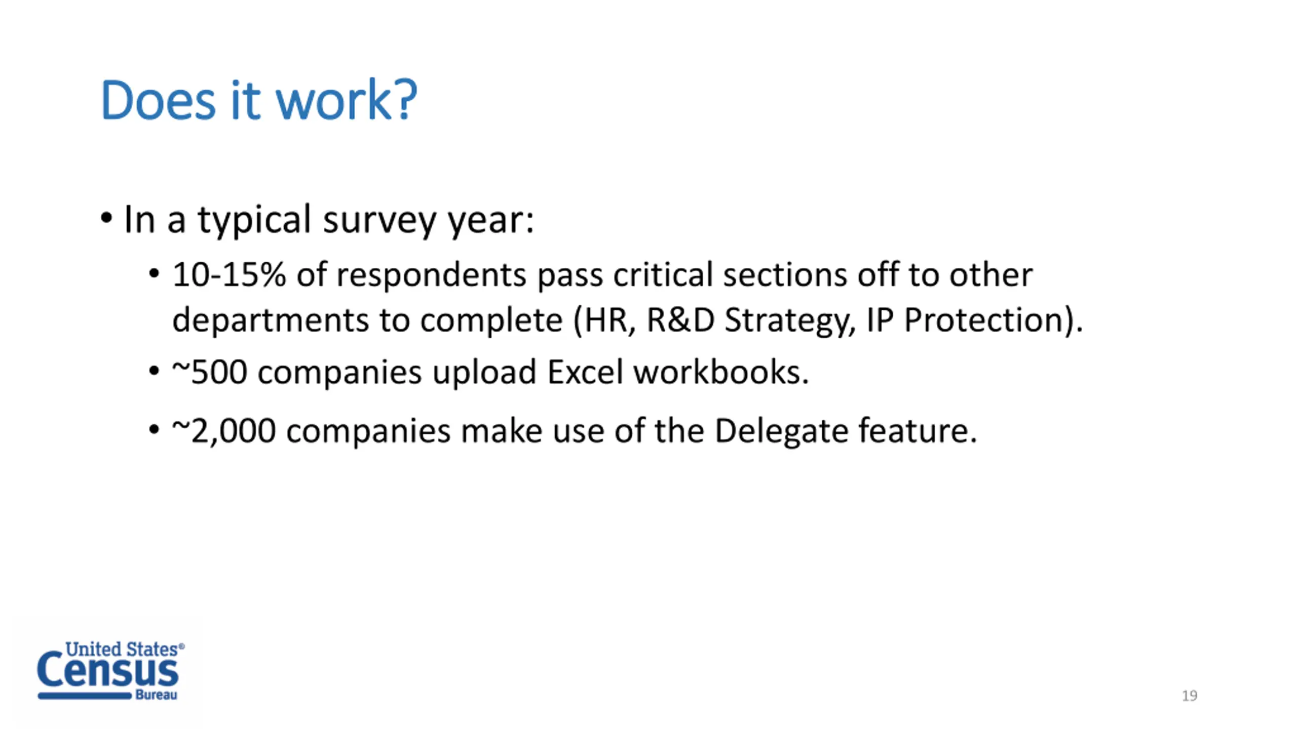 Does it work? Does it work? In a typical survey year: 10-15% of respondents pass critical sections off to other departments to complete (HR, R&D Strategy, IP Protection). ~500 companies upload Excel workbooks. ~2,000 companies make use of the Delegate feature. 19
