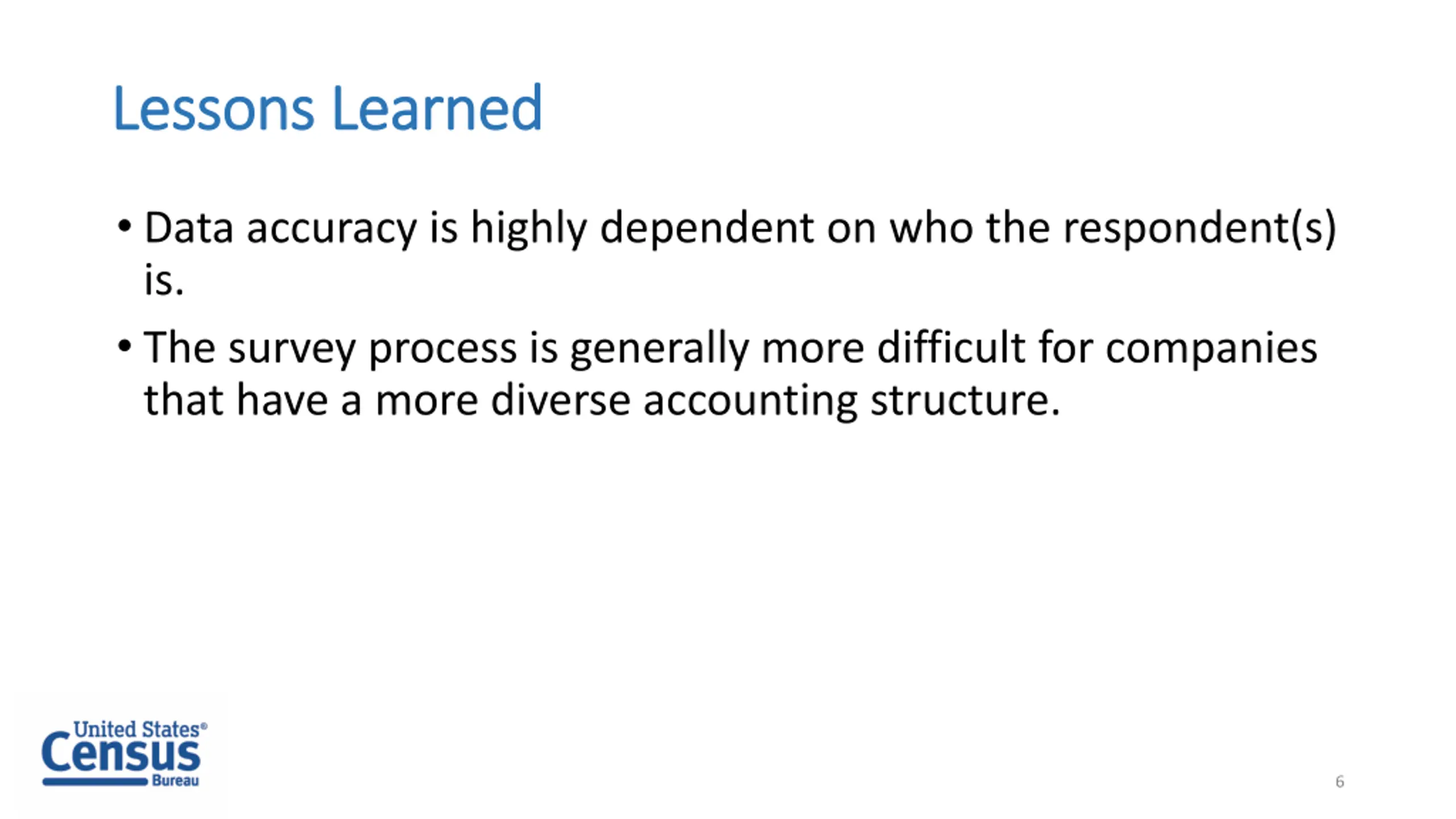 Lessons Learned Lessons Learned Data accuracy is highly dependent on who the respondent(s) is. The survey process is generally more difficult for companies that have a more diverse accounting structure. 6