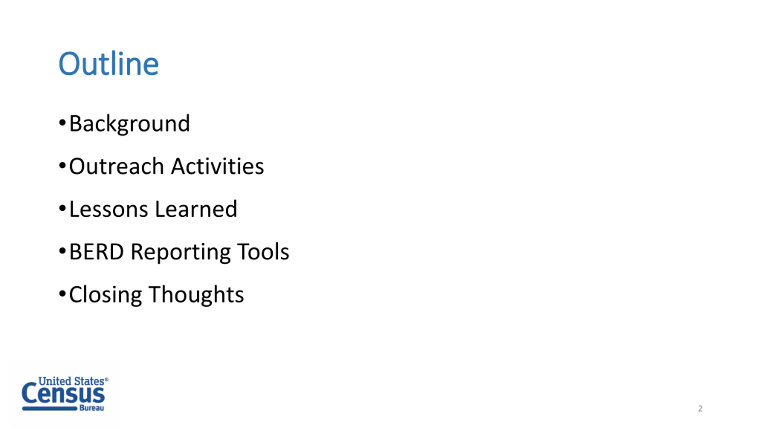 Outline Outline Background Outreach Activities Lessons Learned BERD Reporting Tools Closing Thoughts 2