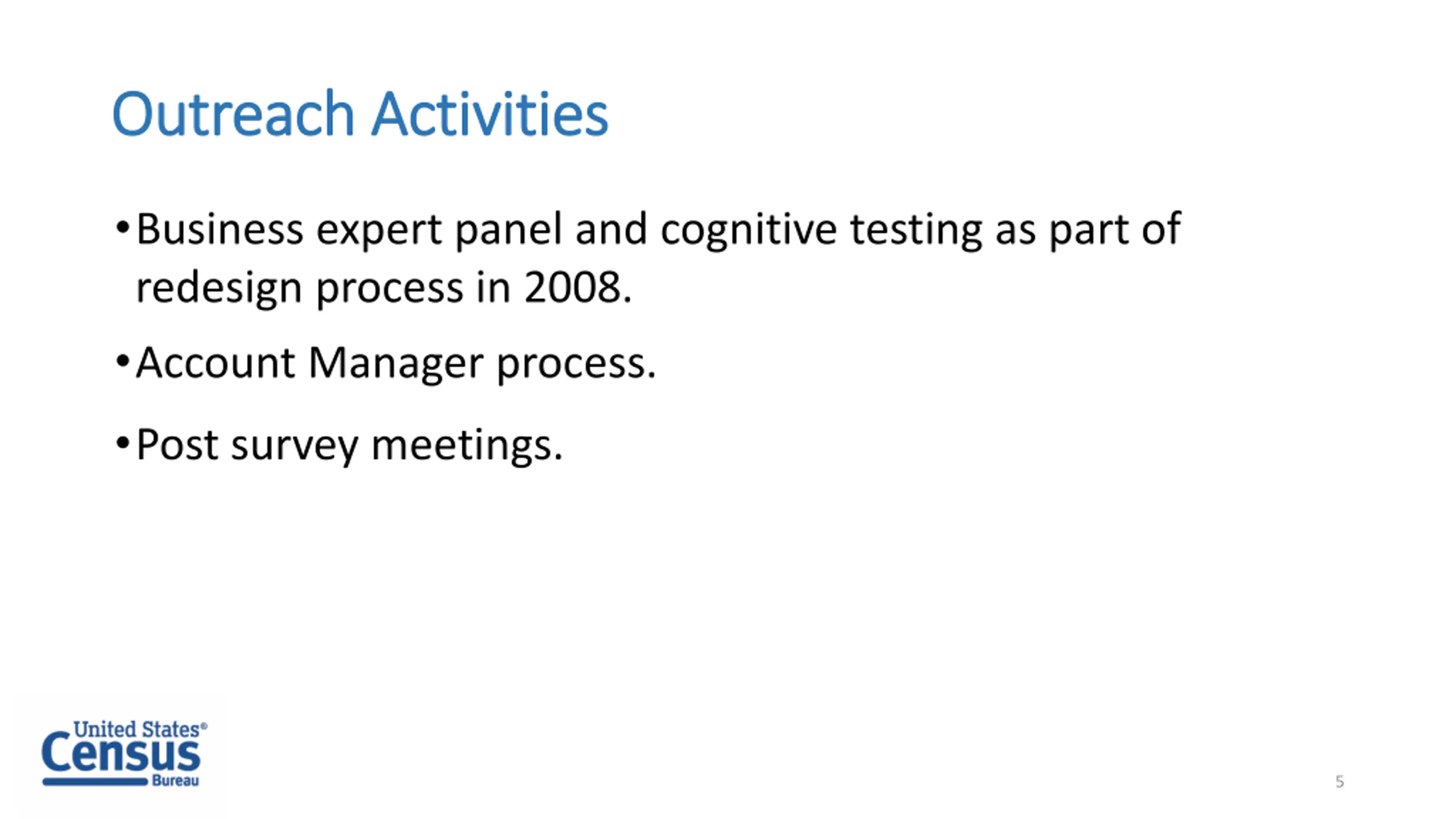 Outreach Activities Outreach Activities Business expert panel and cognitive testing as part of redesign process in 2008. Account Manager process. Post survey meetings. 5