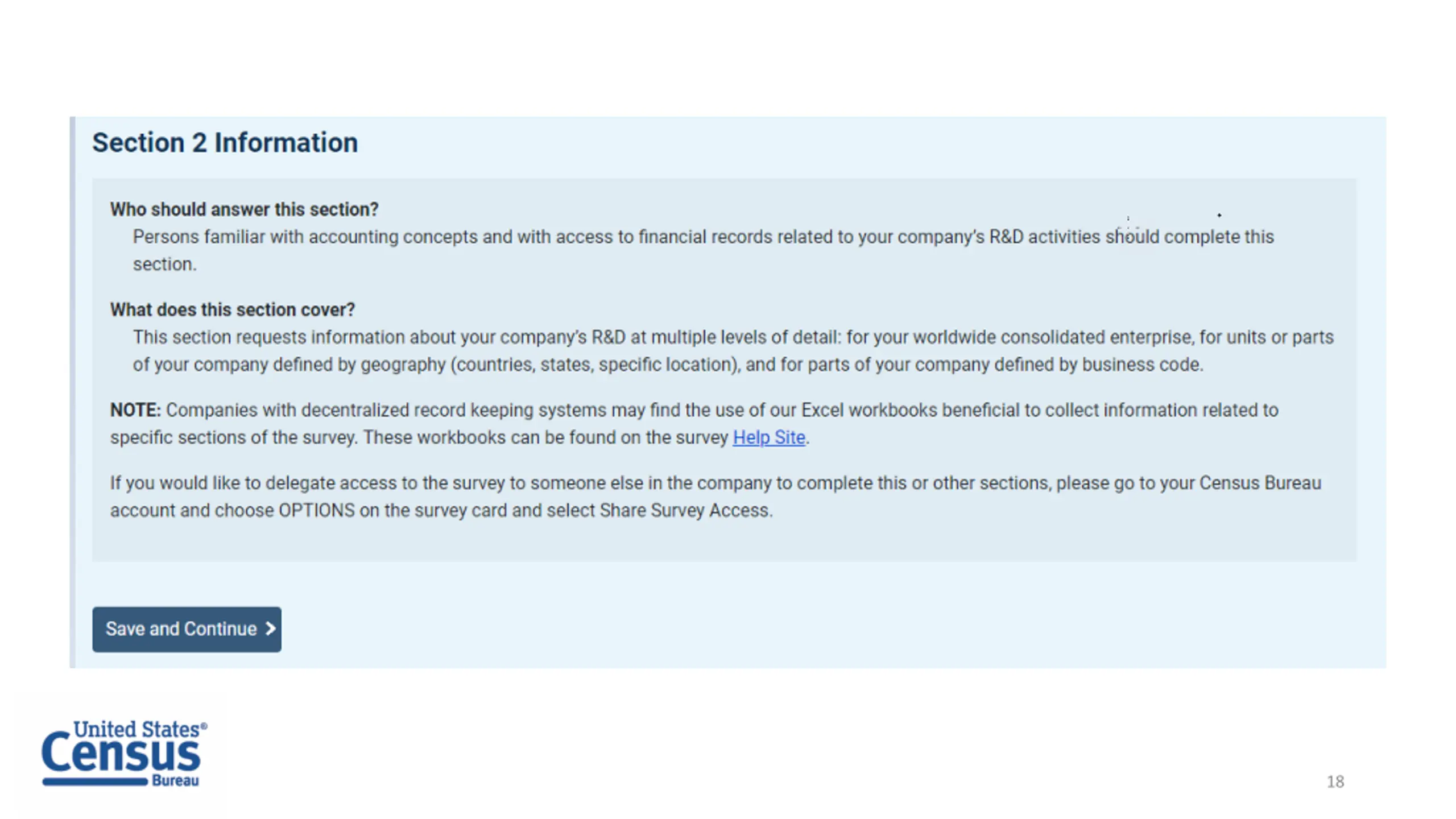 How do we obtain buy in? ? Excel Workbooks and Consolidator Tool are on the survey help site. Account Managers discuss the tools and their benefits with respondents through the course of their regular contacts. Within the online survey instrument, at the beginning of each section, we tell respondents What does this section cover?, Who should answer this section?, and provide links / information on Excel workbooks and delegation feature. 17