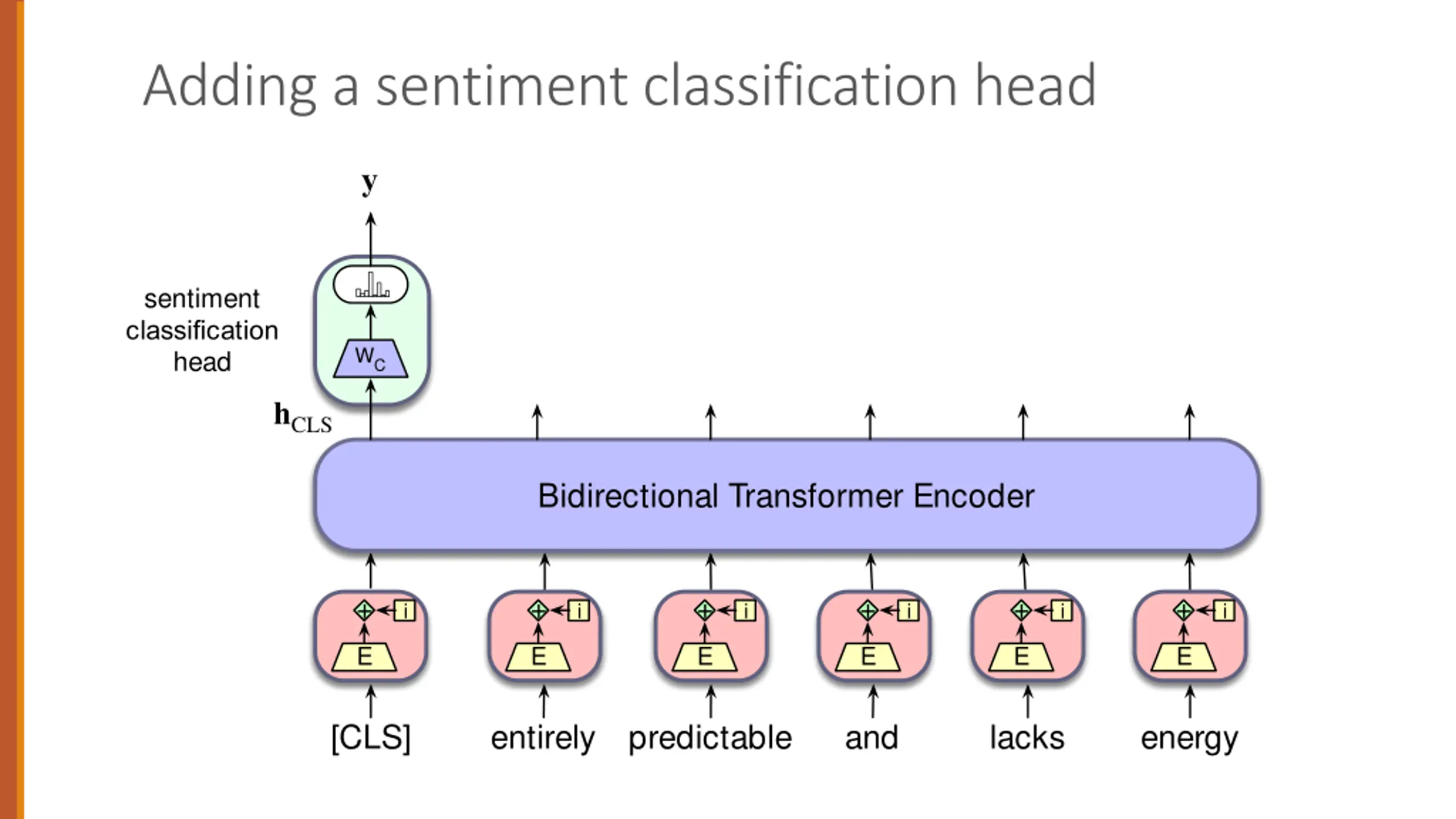Adding a sentiment classification head y sentiment classification head WC hCLS Bidirectional Transformer Encoder + + + + + + i i i i i i E E E E E E [CLS] entirely predictable and lacks energy