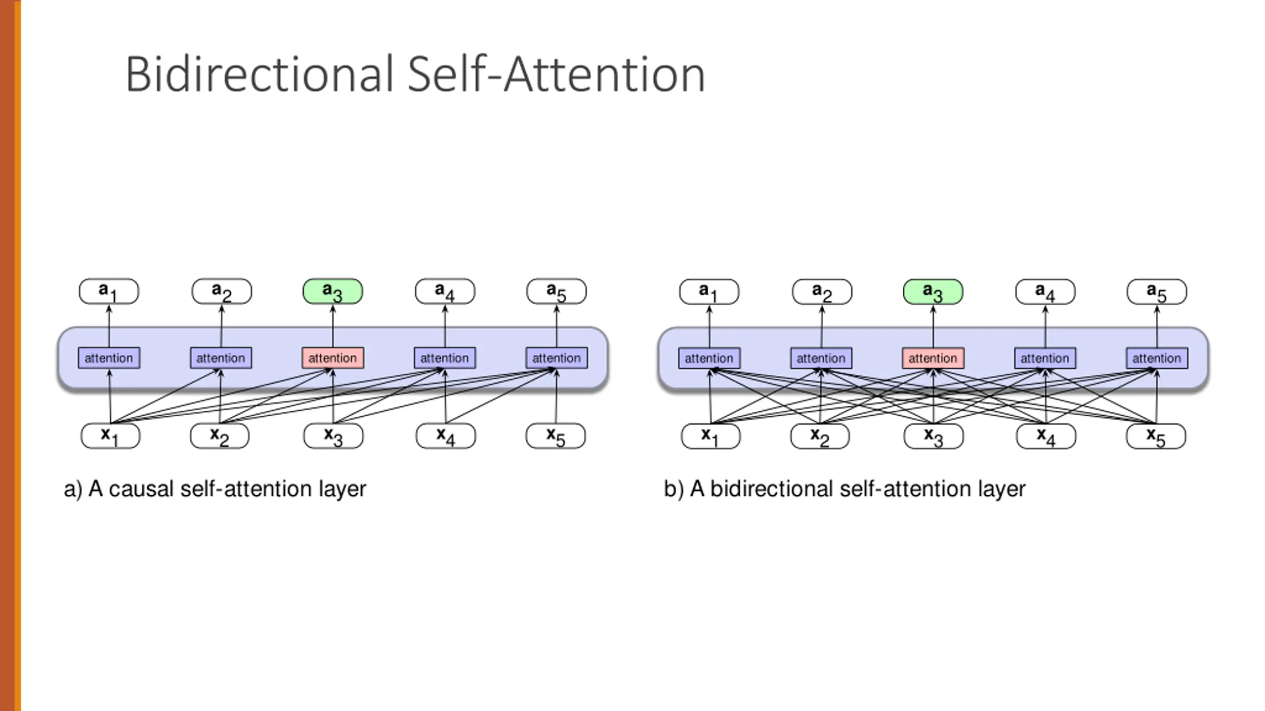 Bidirectional Self-Attention a1 a2 a3 a4 a5 a1 a2 a3 a4 a5 attention attention attention attention attention attention attention attention attention attention x1 x2 x3 x4 x5 x1 x2 x3 x4 x5 a) A causal self-attention layer b) A bidirectional self-attention layer