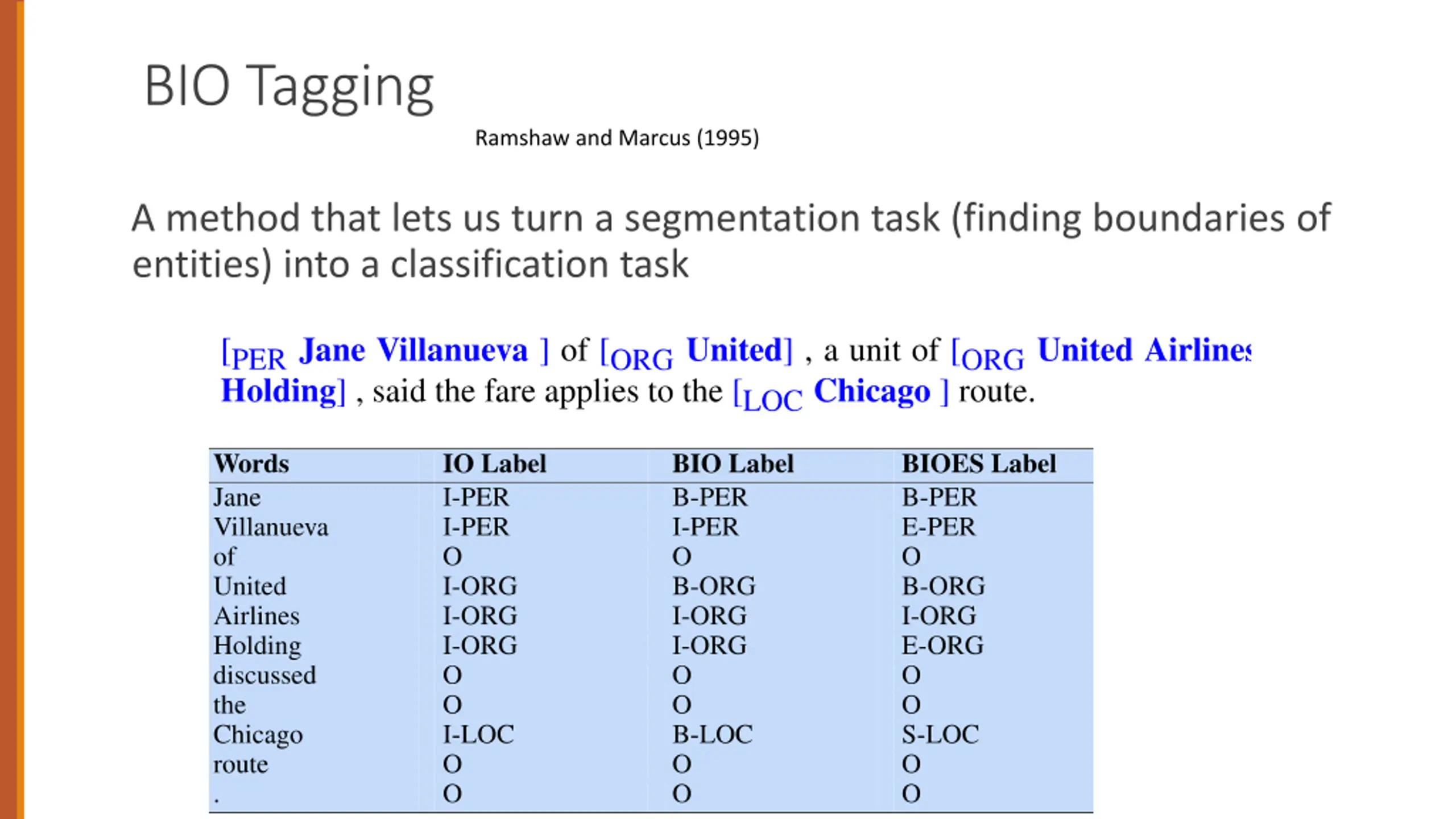 BIO Tagging Ramshaw and Marcus (1995) A method that lets us turn a segmentation task (finding boundaries of entities) into a classification task