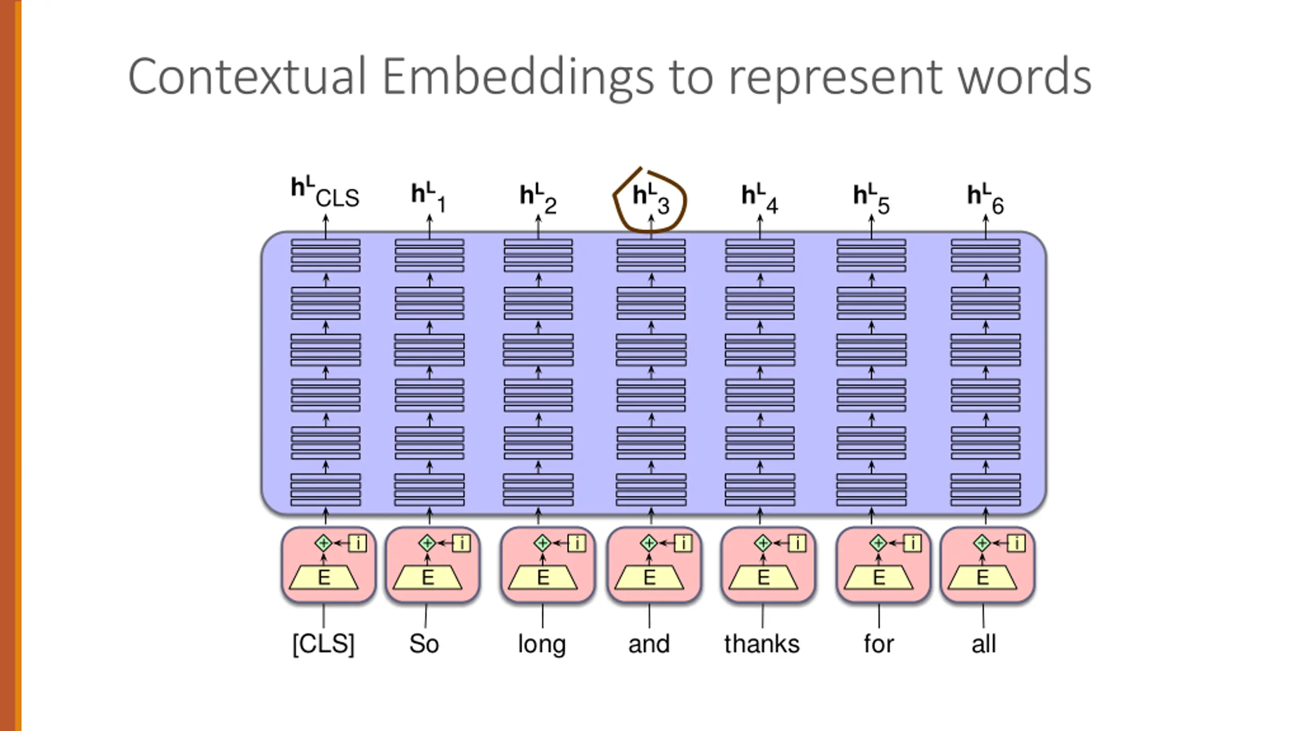 Contextual Embeddings to represent words hLCLS hL1 hL2 hL3 hL4 hL5 hL6 + + + + + + + i i i i i i i E E E E E E E [CLS] So long and thanks for all