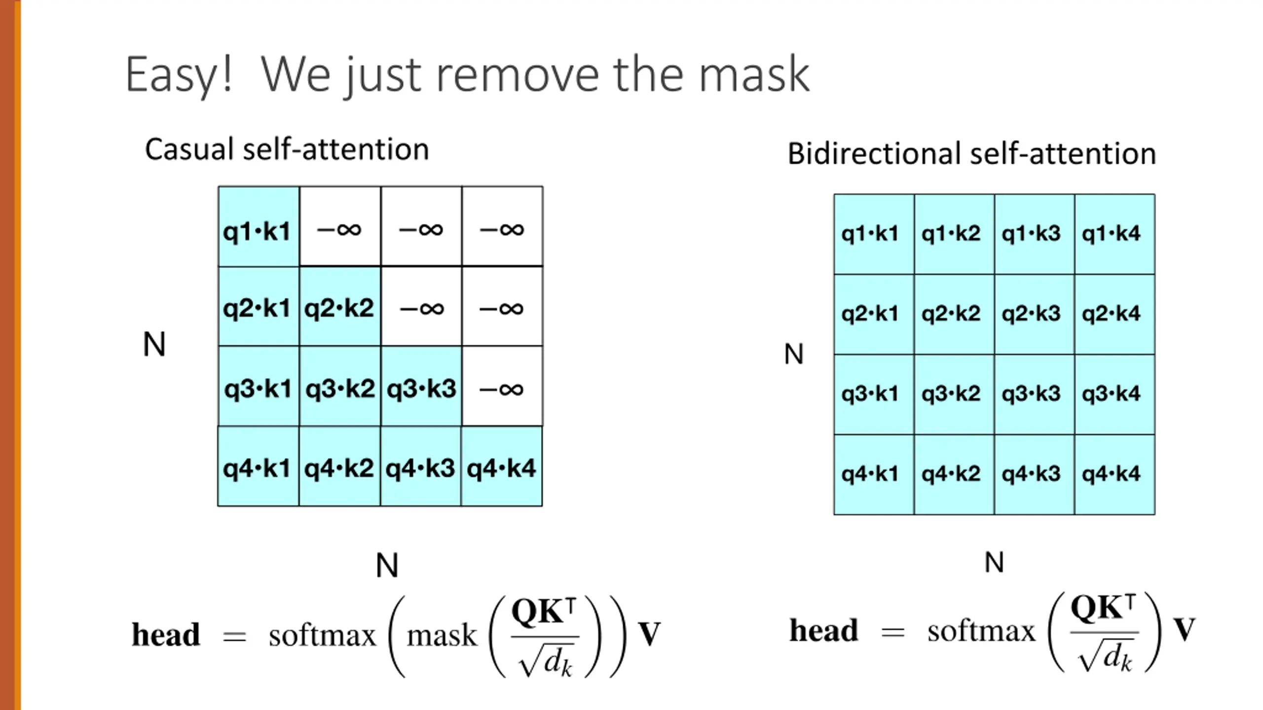 Easy! We just remove the mask Casual self-attention Bidirectional self-attention