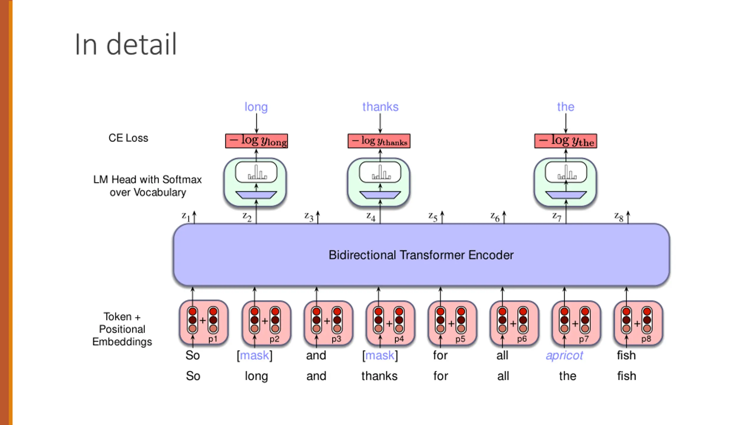 In detail long thanks the CE Loss LM Head with Softmax over Vocabulary z1 z2 z3 z4 z5 z6 z7 z8 Bidirectional Transformer Encoder Token + Positional Embeddings + + + + + + + + p4 p6 p8 p1 p3 p5 p7 p2 So [mask] and [mask] for all apricot fish So long and thanks for all the fish