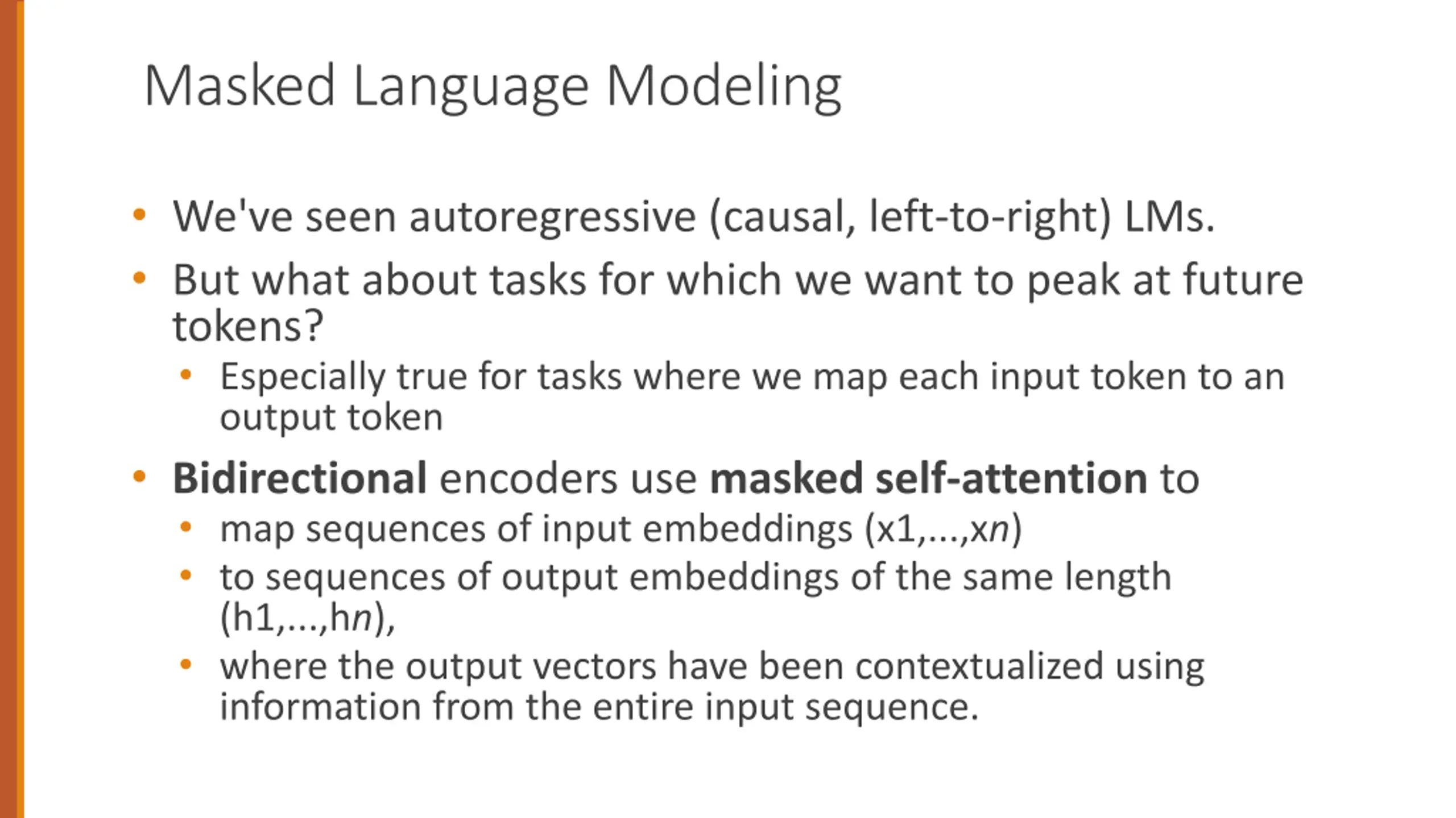 Masked Language Modeling We've seen autoregressive (causal, left-to-right) LMs. But what about tasks for which we want to peak at future tokens? Especially true for tasks where we map each input token to an output token Bidirectional encoders use masked self-attention to map sequences of input embeddings (x1,...,xn) to sequences of output embeddings of the same length (h1,...,hn), where the output vectors have been contextualized using information from the entire input sequence.