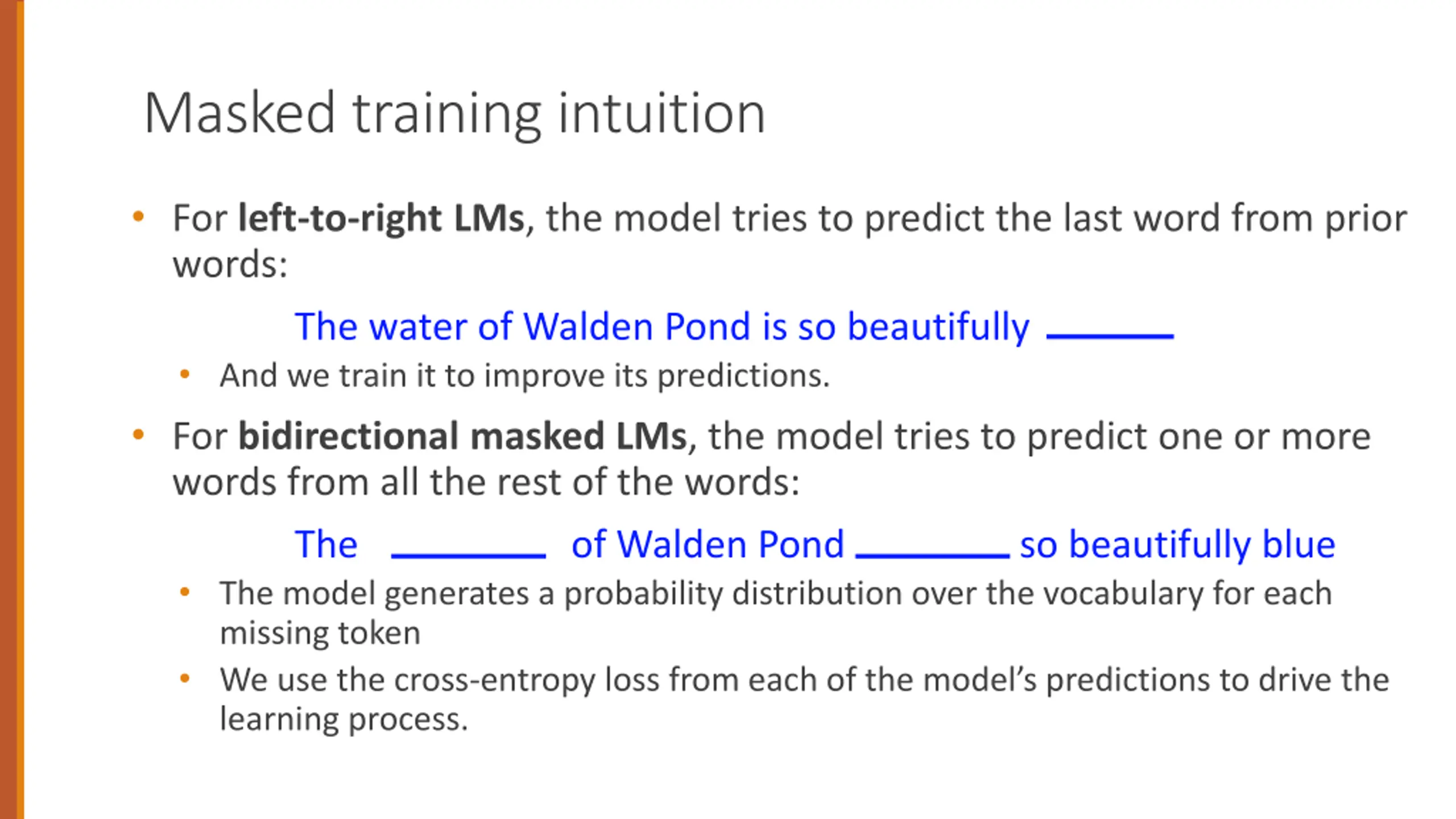 Masked training intuition For left-to-right LMs, the model tries to predict the last word from prior words: The water of Walden Pond is so beautifully And we train it to improve its predictions. For bidirectionalmasked LMs, the model tries to predict one or more words from all the rest of the words: The of Walden Pond so beautifully blue The model generates a probability distribution over the vocabulary for each missing token We use the cross-entropy loss from each of the model s predictions to drive the learning process.