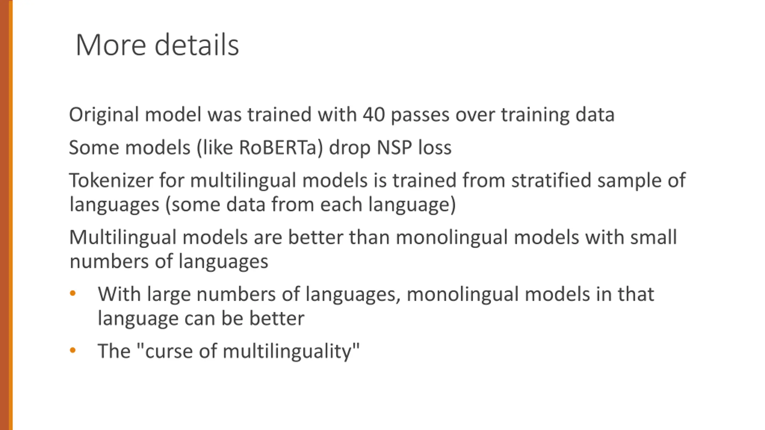 More details Original model was trained with 40 passes over training data Some models (like RoBERTa) drop NSP loss Tokenizer for multilingual models is trained from stratified sample of languages (some data from each language) Multilingual models are better than monolingual models with small numbers of languages With large numbers of languages, monolingual models in that language can be better The "curse of multilinguality"